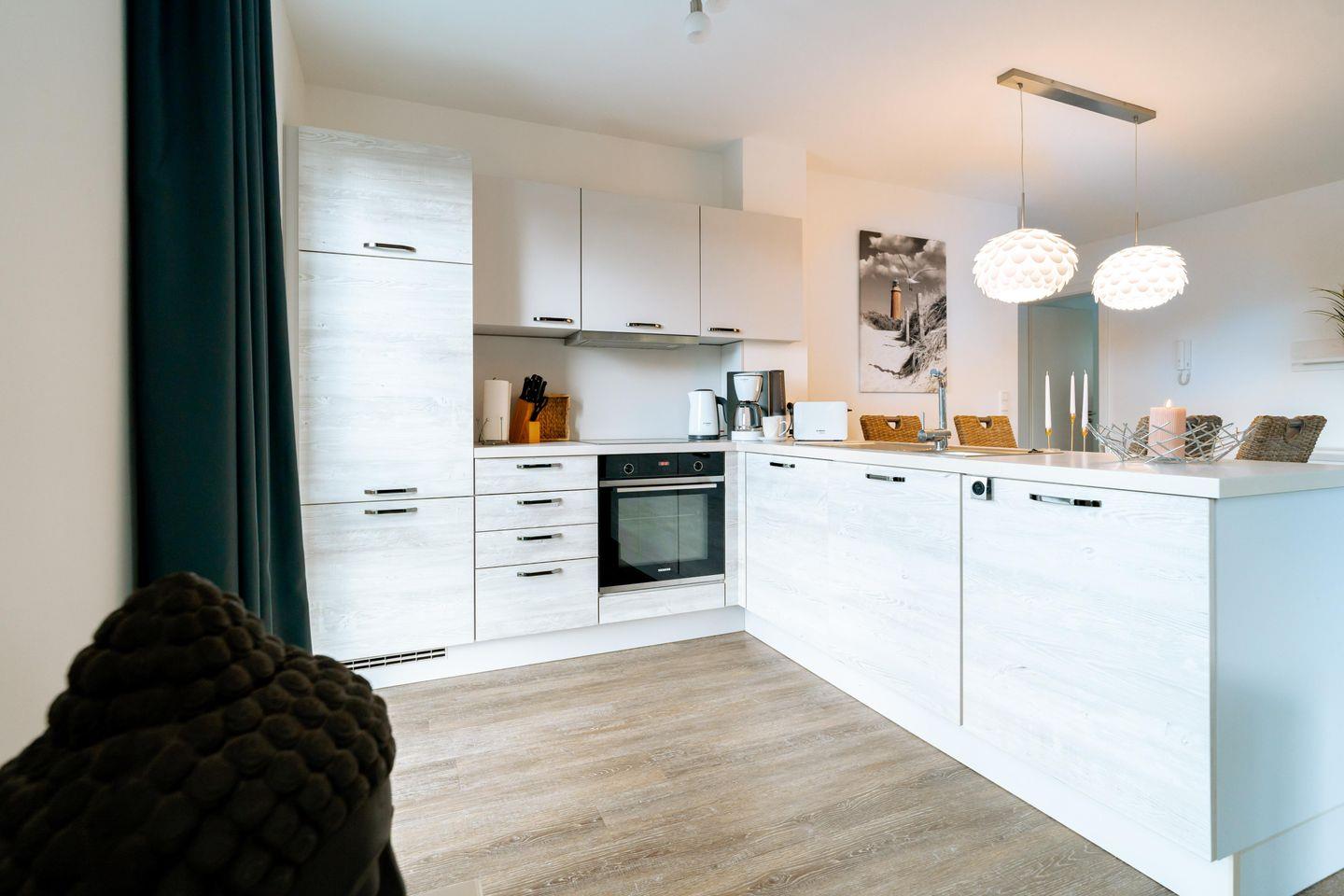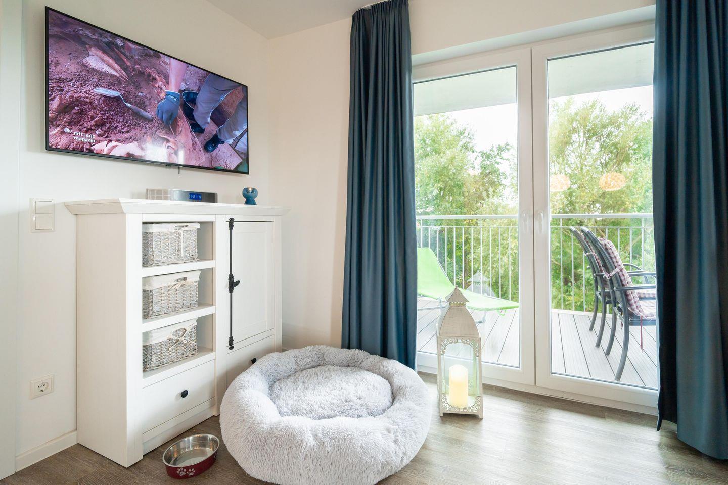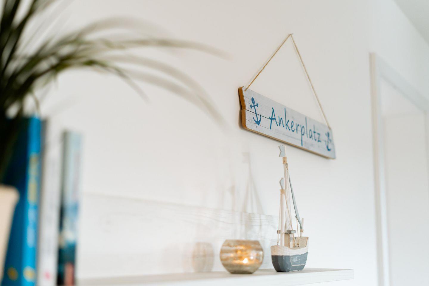 Die Ferienwohnung "Ankerplatz" bietet auf ihren großzügigen 80 Quadratmetern alles, was Ihr für einen entspannten Urlaub benötigt. Der Wohnbereich lädt mit einem gemütlichen Sofa und einem Schwingsessel mit Fußteil zum Verweilen ein. Das umfangreiche Entertainmentpaket mit Fernseher und Musikanlage sorgt für zusätzlichen Komfort. Ein großzügiger Essbereich für die ganze Familie, sowie eine gut ausgestattete Küche mit Herd, Mikrowelle, Spülmaschine und allem, was das Herz begehrt, runden das Angebot ab.