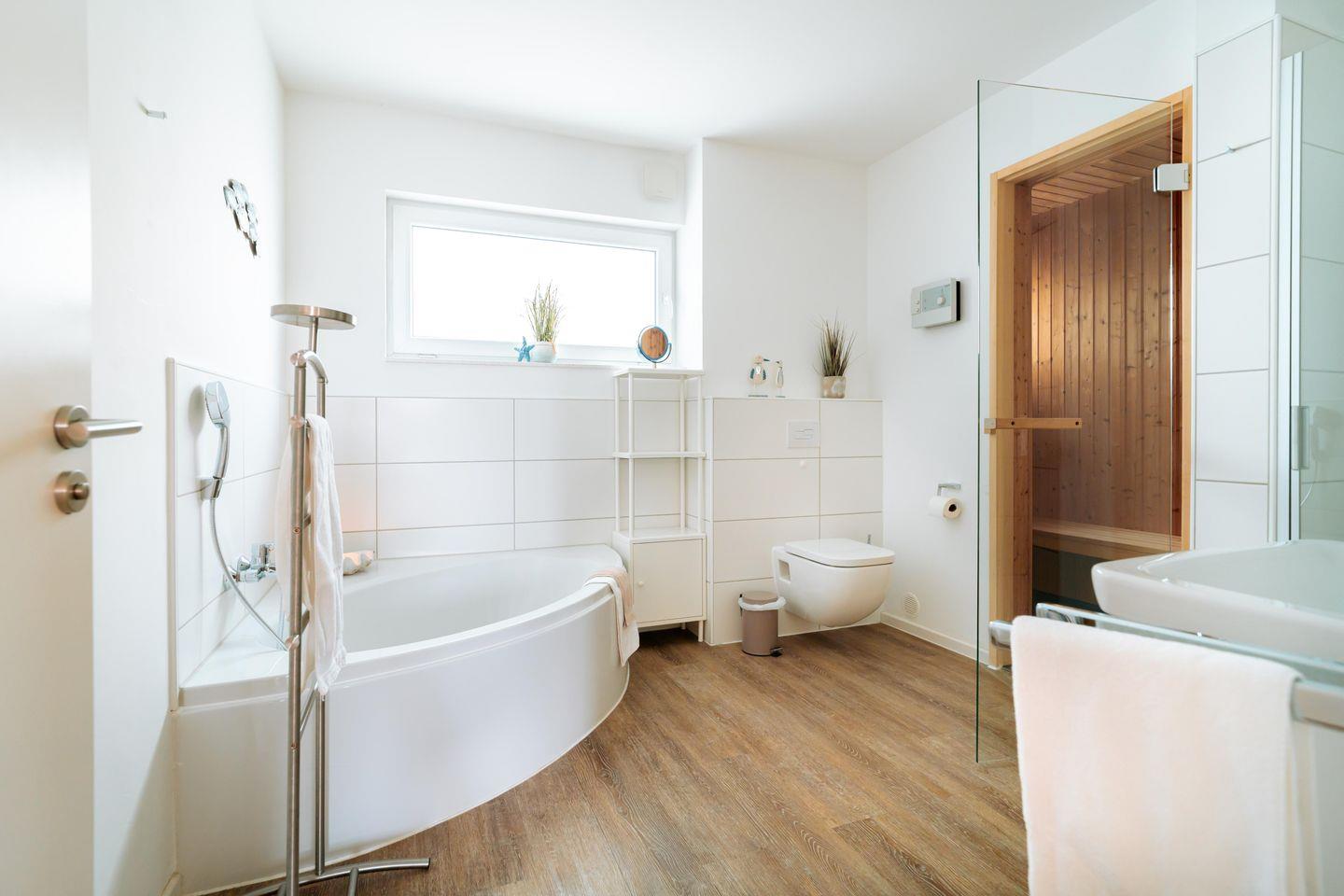 Nach einem langen Tag an der frischen Nordseeluft könnt Ihr in Eurer privaten Sauna entspannen. Für zusätzlichen Komfort haben wir eine Kopfstütze integriert. Das Badezimmer ist modern und funktional ausgestattet, mit Badewanne, Dusche, Kosmetikspiegel und Föhn.