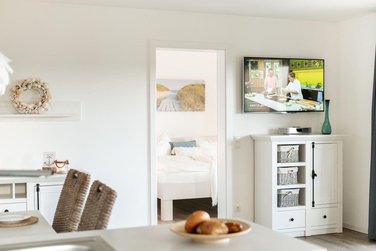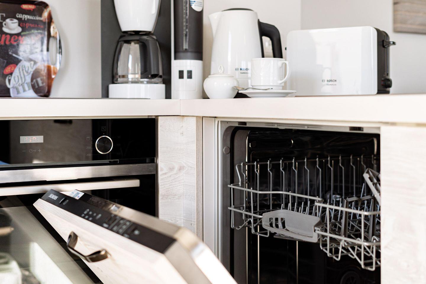 In der voll ausgestatteten Küche könnt Ihr kulinarische Träume wahr werden lassen. Neben den üblichen Geräten wie Herd, Backofen und Spülmaschine bietet die Küche eine hochwertige Küchenmaschine, die das Herz jedes Hobbykochs höherschlagen lässt. Ob frische Nordseekrabben brutzeln oder ein saftiger Apfelkuchen – hier macht das Kochen richtig Spaß!