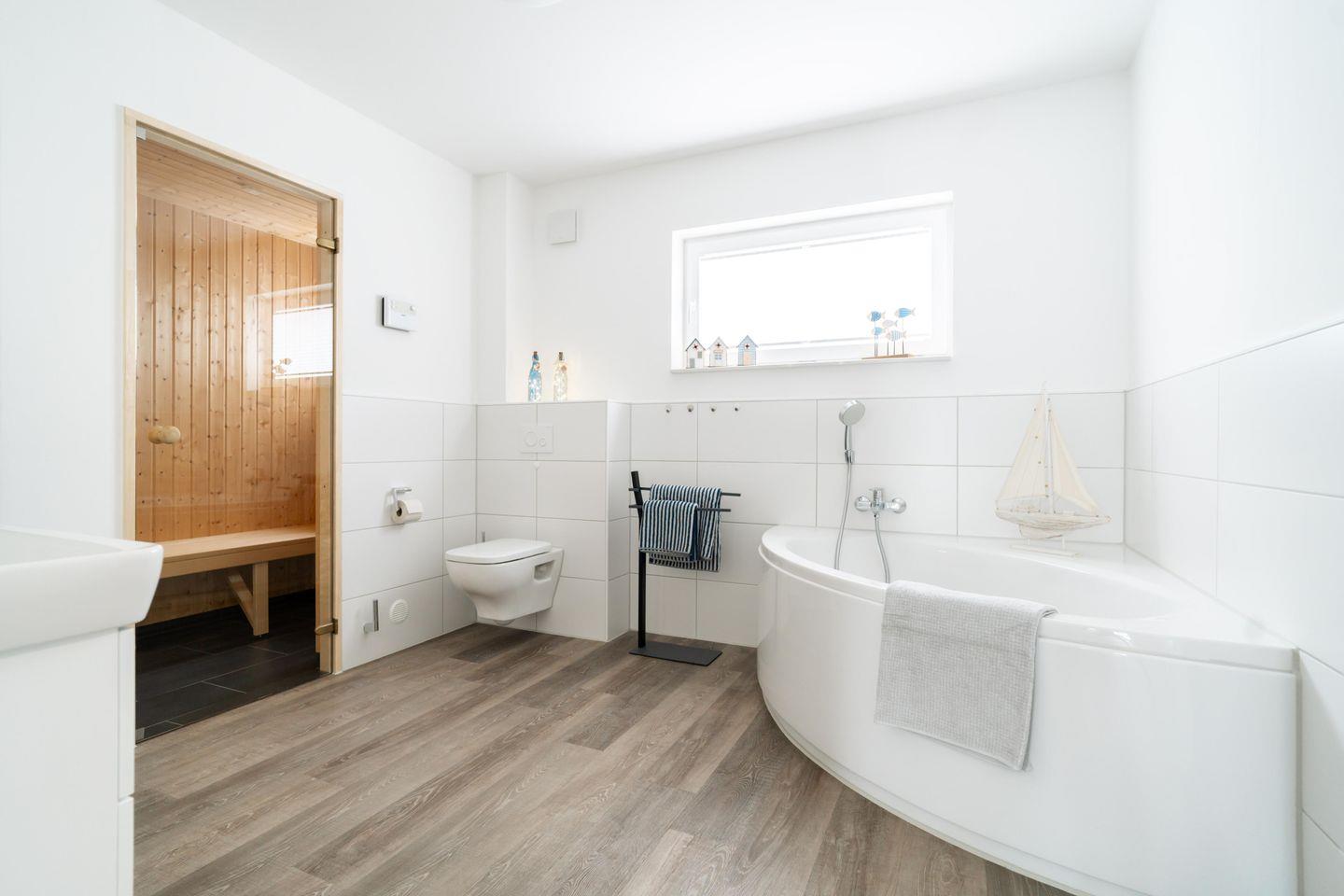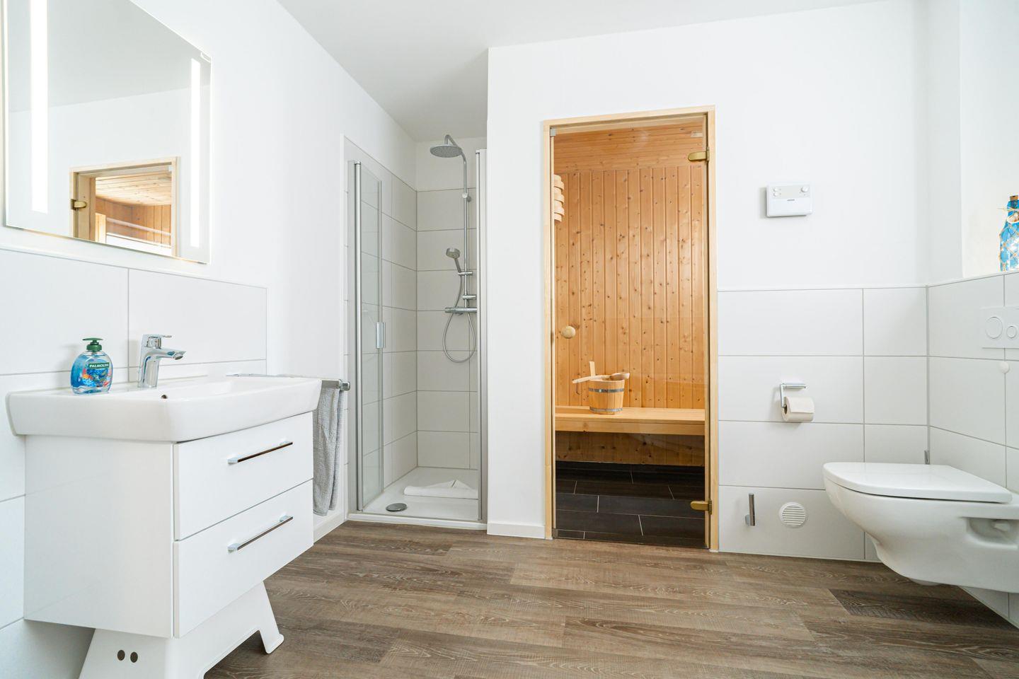 Ein Highlight der „Seaside“ ist die private Sauna im Badezimmer. Nach einem langen Strandspaziergang oder einer Radtour könnt Ihr hier wunderbar entspannen und Eure Muskeln lockern. Die leicht zugängliche Dusche und die Badewanne bieten Euch zusätzlichen Komfort.