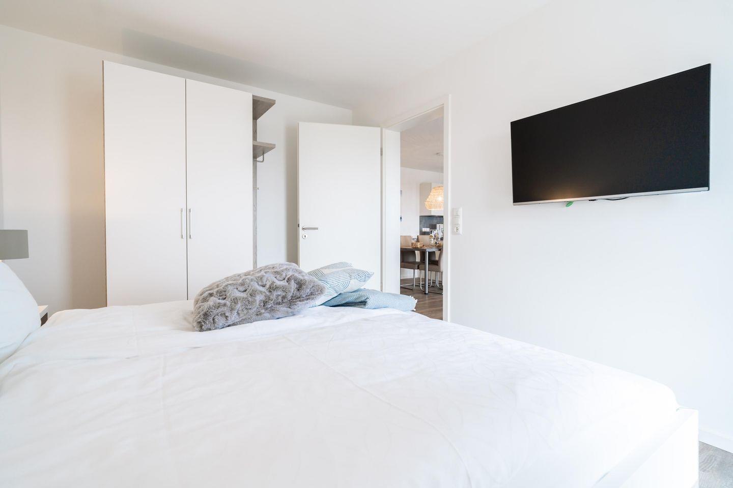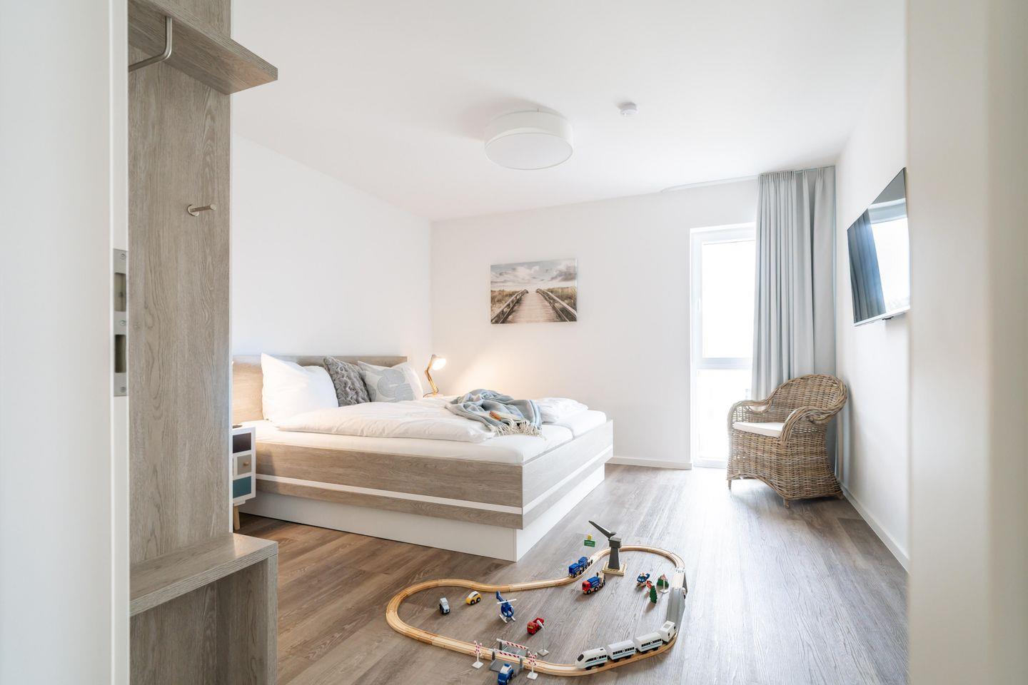 Die Ferienwohnung verfügt über zwei Schlafzimmer mit bequemen Betten, großzügigen Kleiderschränken und selbstverständlich über Fernseher in jedem Zimmer. So kann jeder seinen Lieblingsfilm oder eine Kindersendung ungestört genießen. Im Wohnbereich erwartet Euch ein gemütliches Sofa und zwei bequeme Sessel – der ideale Ort für gemeinsames Lesen, Spielen oder einfach zum Relaxen. Ein umfangreiches Entertainmentpaket mit Fernseher sorgt für beste Unterhaltung an Regentagen.