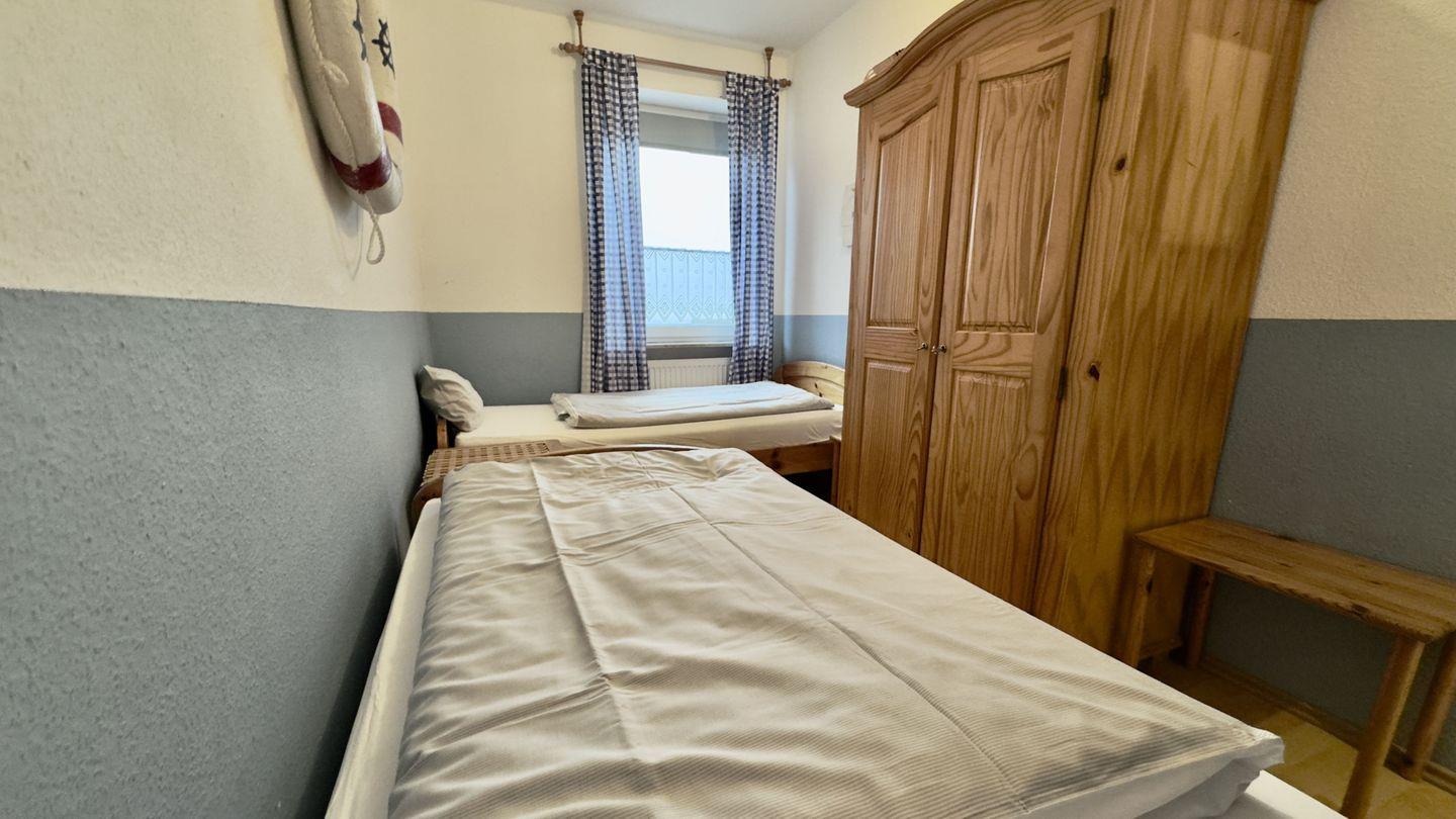 Das separate Schlafzimmer mit zwei Einzelbetten bietet erholsame Nächte und Platz für 2 Personen. Ein Highlight ist der vom Wohnzimmer aus zugängliche Balkon. Hier können Sie sonnige Tage genießen, den Blick über Horumersiel schweifen lassen und einfach entspannen.