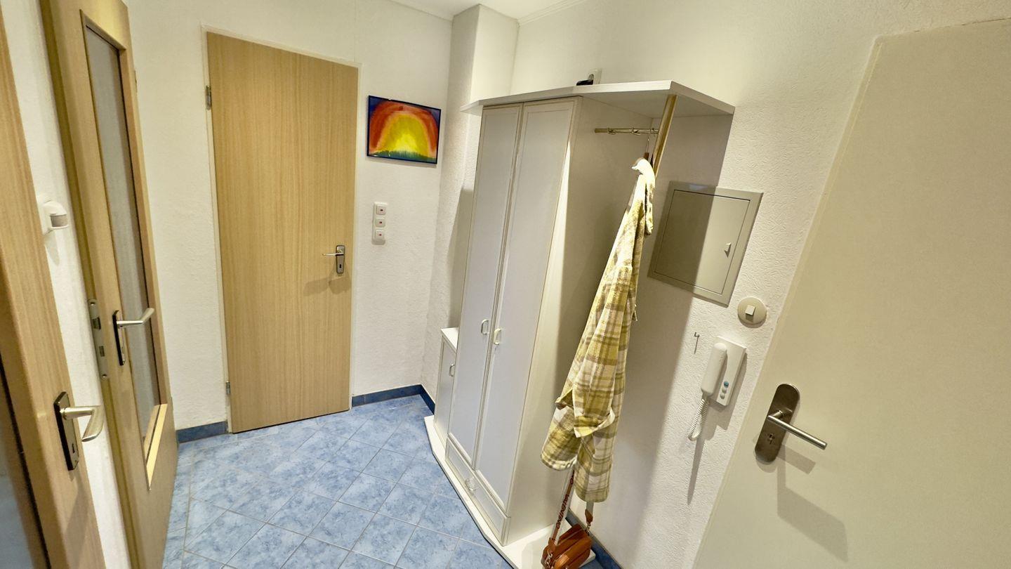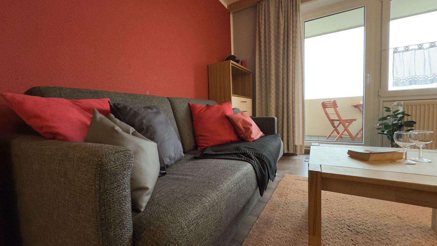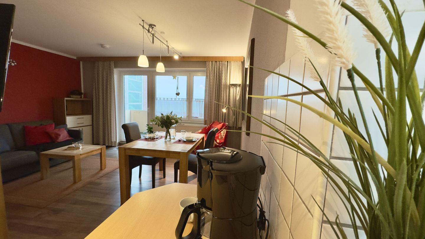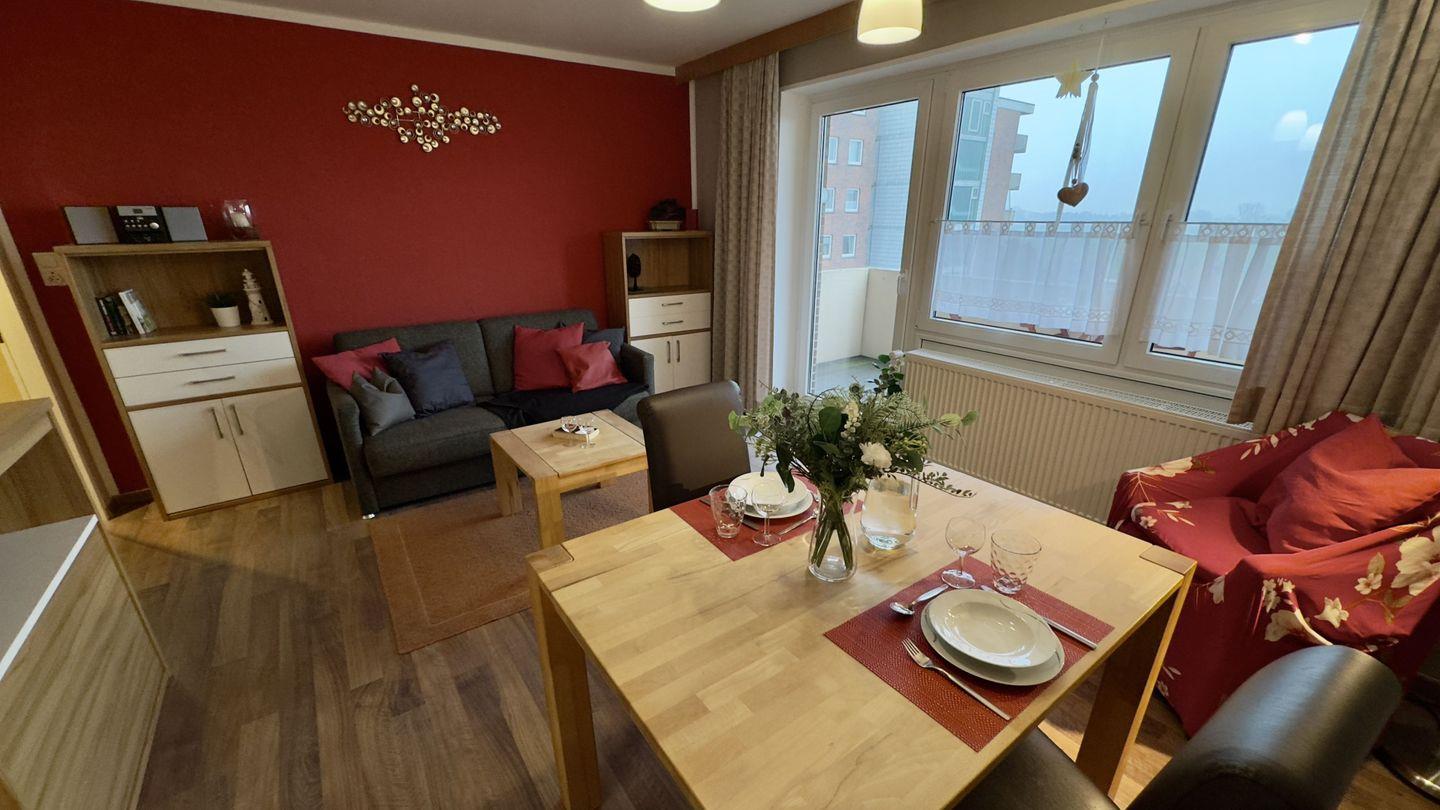 Schon der kleine, aber feine Vorflur heißt Sie herzlich willkommen. Mit einer Garderobe und Stauraum bietet er Platz für Ihre Kleidung. Von hier aus gelangen Sie in das helle, freundlich gestaltete Wohnzimmer, das mit einer großen Fensterfront für eine lichtdurchflutete Atmosphäre sorgt. Genießen Sie entspannte Stunden auf dem komfortablen Schlafsofa, das zugleich eine zusätzliche Schlafmöglichkeit bietet. Ob Sie den Ausblick schweifen lassen oder es sich vor dem TV gemütlich machen – hier fühlen Sie sich wie zuhause. Der Essbereich im Wohnzimmer lädt mit einer gemütlichen Sitzgruppe zu gemeinsamen Mahlzeiten ein.