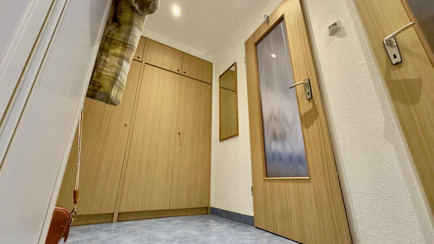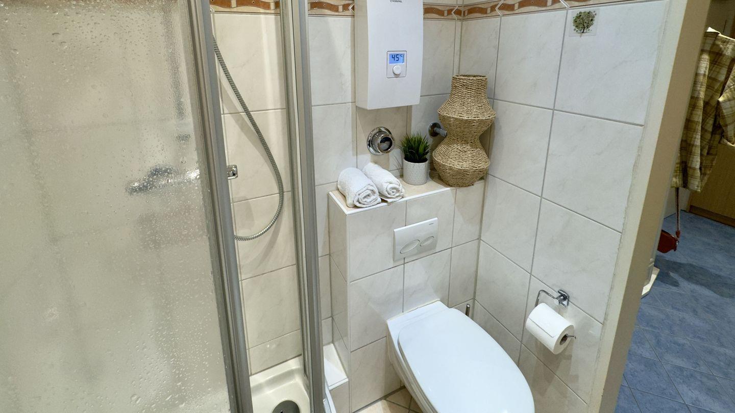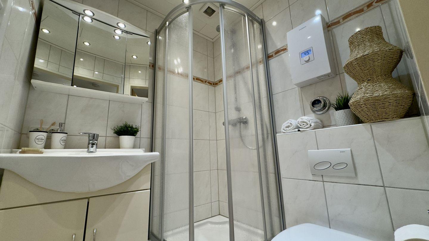 Die angrenzende Wohnküche ist perfekt ausgestattet und bietet alles, was Sie für Ihre Selbstversorgung benötigen. Das hell geflieste Badezimmer überzeugt durch Funktionalität auf kleinem Raum und bietet alles, was Sie für Ihre tägliche Hygiene brauchen.