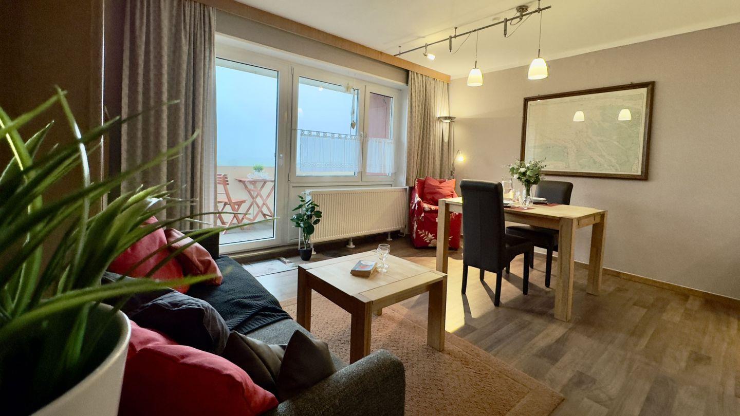 Ideal für bis zu 4 Personen, erwartet Sie ein gemütlicher Rückzugsort in der 5. Etage mit herrlichem Balkonblick über den charmanten Ort.