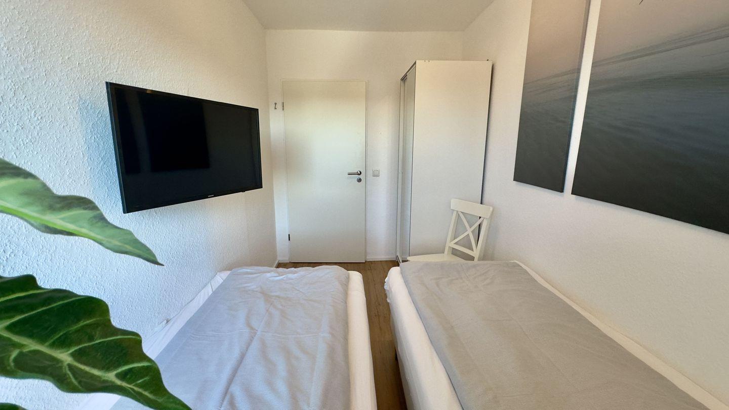 Das separate Schlafzimmer mit zwei Einzelbetten (90x 200 Matratzen) und einem Fernseher bietet einen ruhigen Rückzugsort für erholsame Nächte.