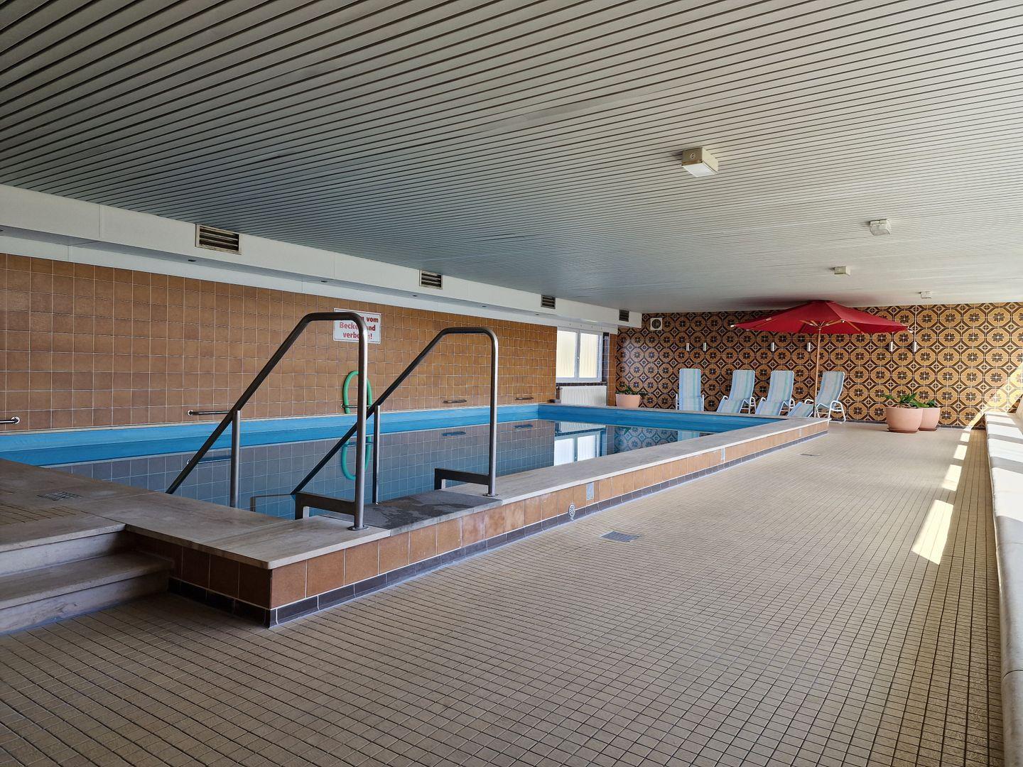 Das Schwimmbad im Erdgeschoss verfügt über eine An- und Umkleide sowie eine Dusche und kann kostenfrei zwischen 7.00 - 13.00 Uhr und zwischen 15.00 und 22.00 Uhr genutzt werden