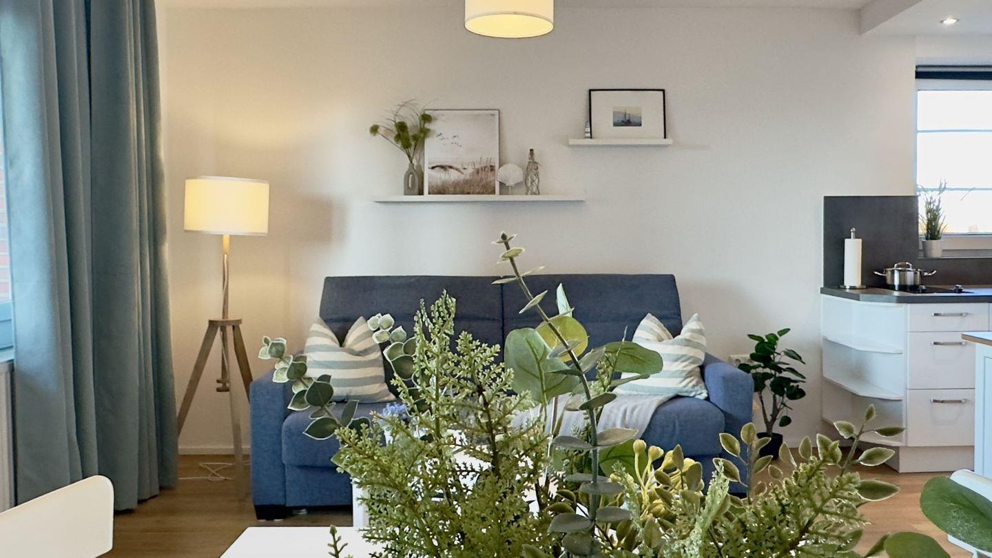 Vom Flur aus gelangen Sie in das offene, lichtdurchflutete Wohnzimmer, das mit seinen modernen Möbeln und hellen Farben begeistert.