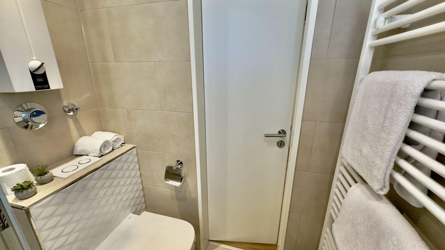 Das moderne Badezimmer mit geschmackvoller Fliesenauswahl schafft eine angenehme Atmosphäre, und der wunderschöne Balkon ist der perfekte Ort, um den Tag bei einem gemütlichen Frühstück oder beim Sonnenbaden zu genießen.