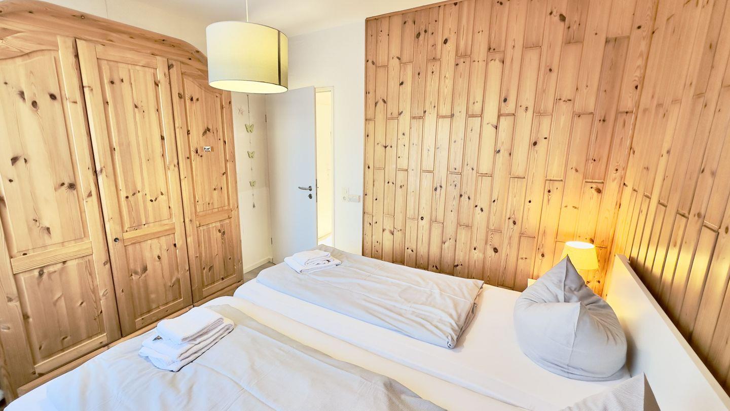 Das separate Schlafzimmer bietet ein Doppelbett mit Einzelmatratzen und einen großzügigen Kleiderschrank. Die warme Holzoptik verleiht dem Raum eine behagliche Atmosphäre, die zum Wohlfühlen einlädt. Das kleine, aber feine Badezimmer verfügt über eine Dusche, einen Spiegel und genügend Platz für Ihre täglichen Bedürfnisse.