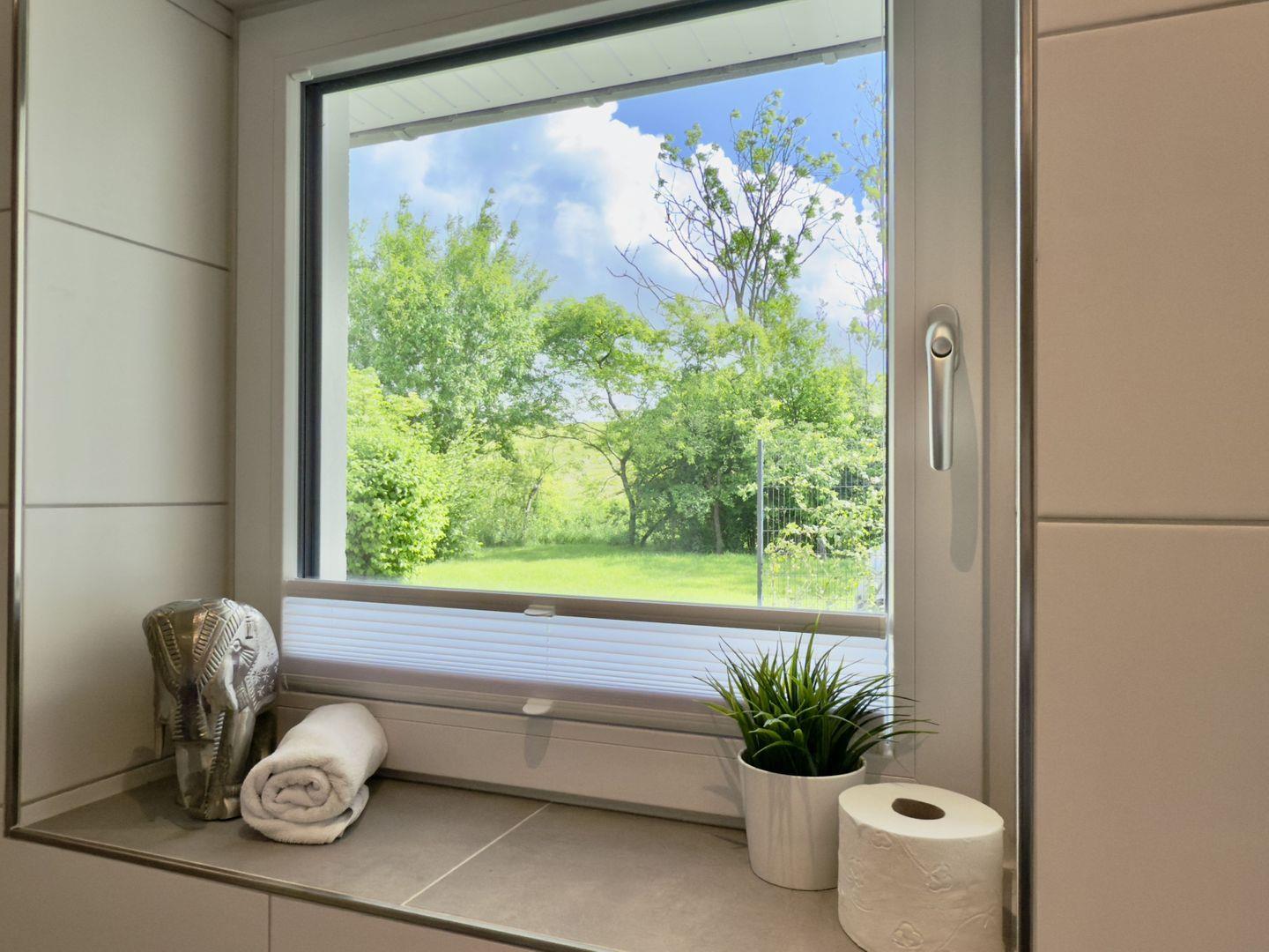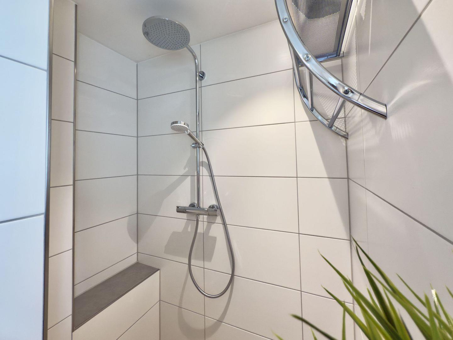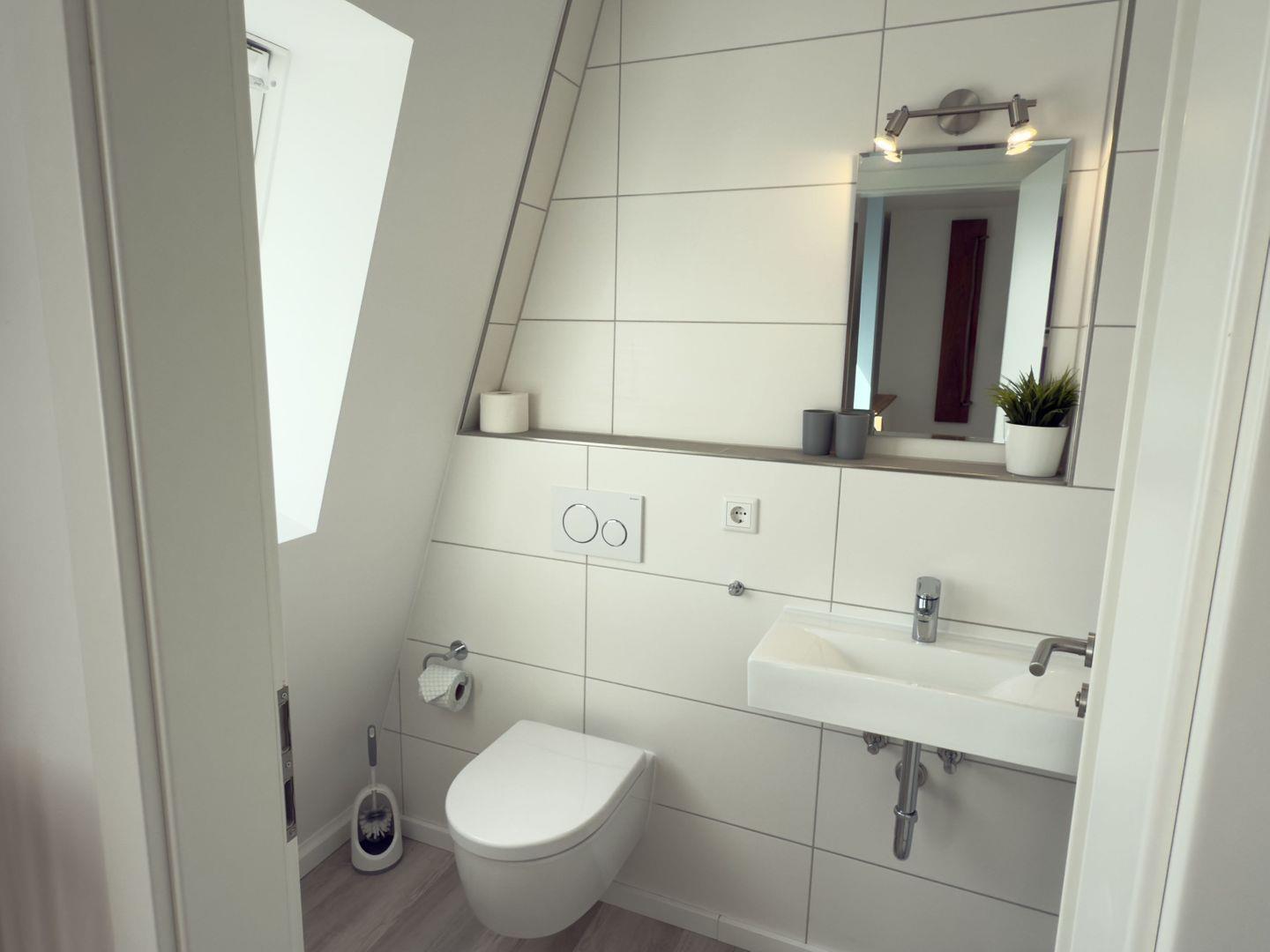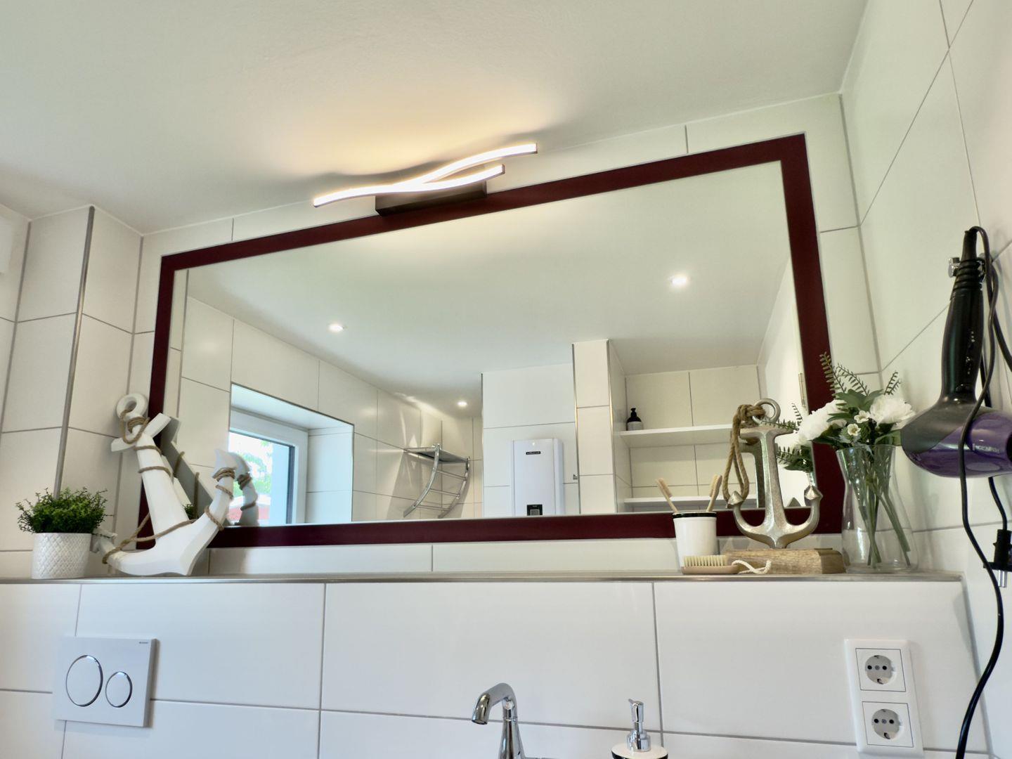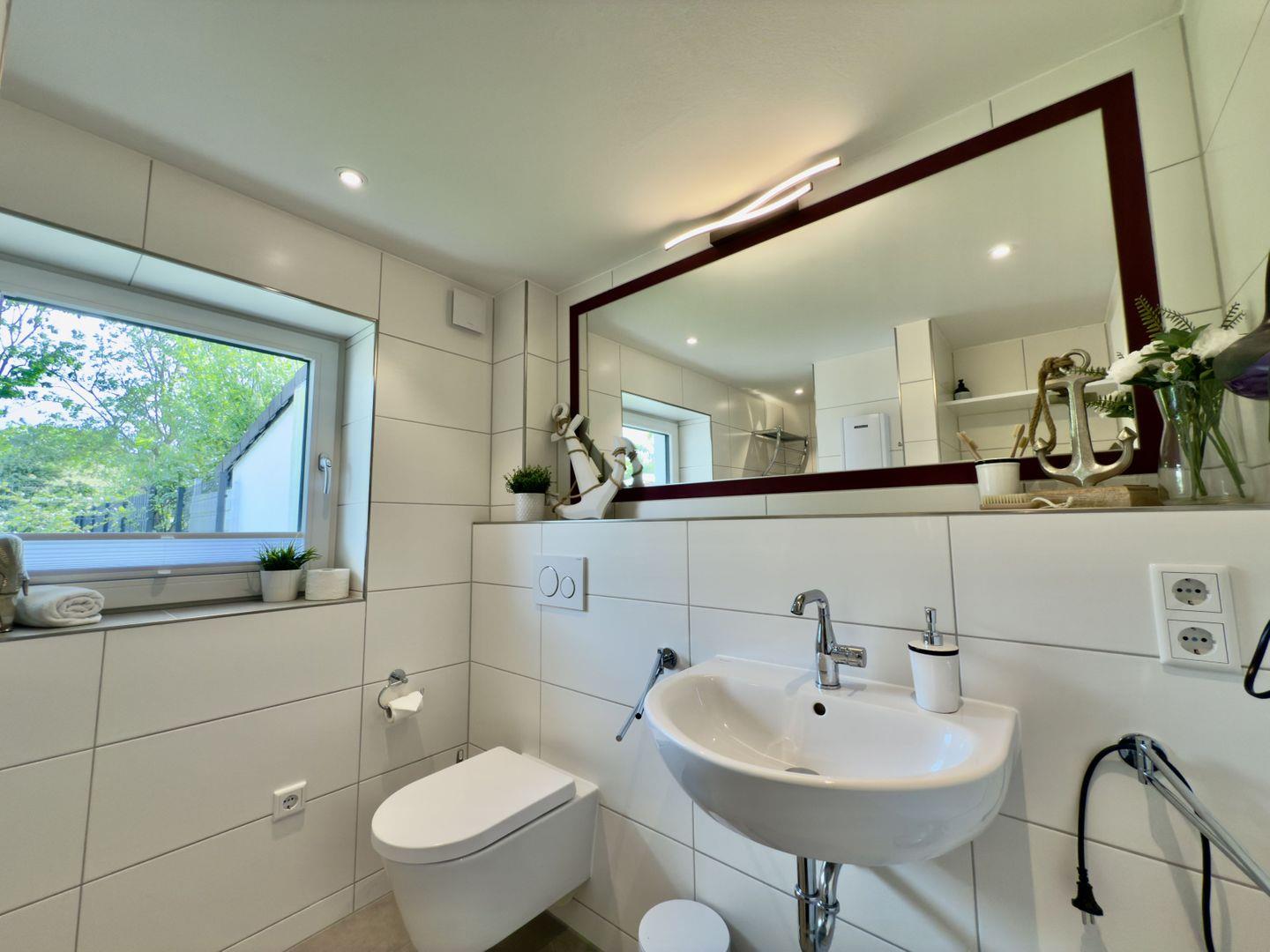 Das helle Tageslichtbad im Erdgeschoss überzeugt mit einer bodengleichen Dusche, einem großen Spiegel und stilvoller Ausstattung – der perfekte Ort für einen entspannten Start in den Tag.