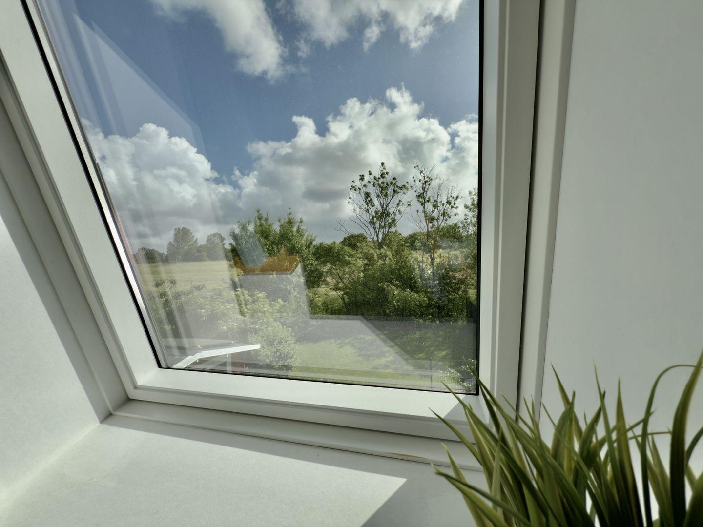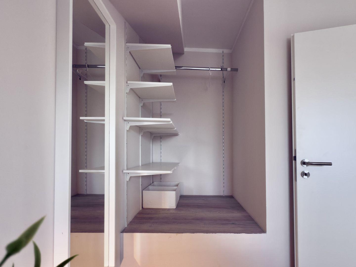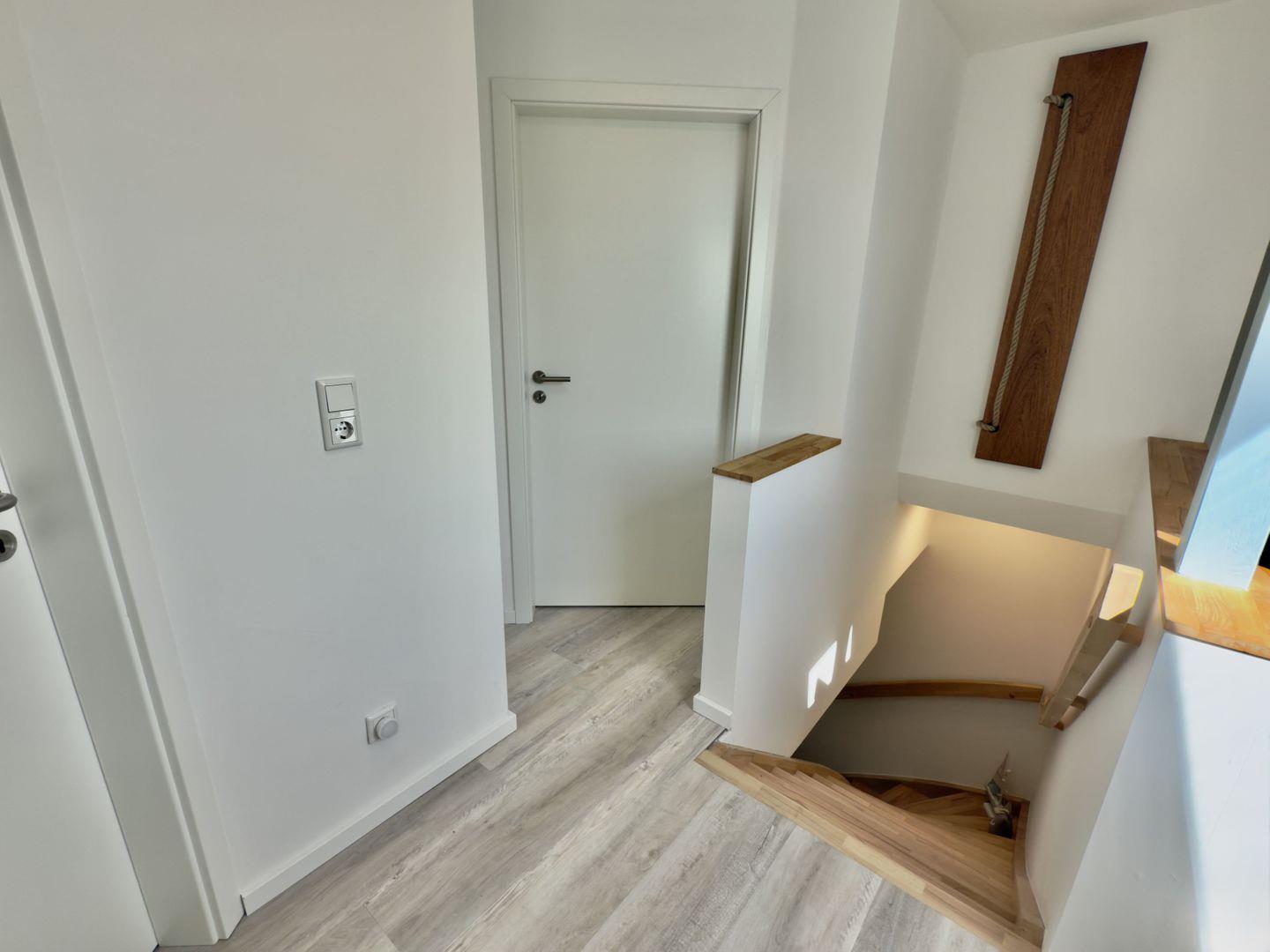 Über eine offene Holztreppe geht es hinauf ins Obergeschoss. Dort erwartet Sie ein freundliches Schlafzimmer mit einem komfortablen Doppelbett, einem geräumigen Kleiderschrank und einem schönen Blick ins Grüne. Ein zusätzliches kleines Gäste-WC sorgt für noch mehr Komfort.