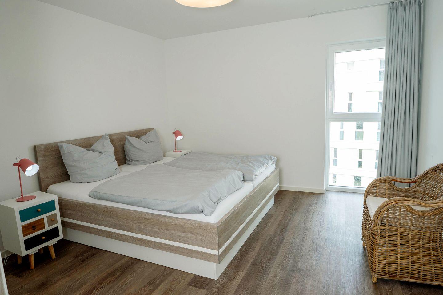 Der helle, große Wohnbereich mit Couch, Sesseln und grossem Fernseher sowie den bodentiefen Fenstern lädt zum gemeinsamen Entspannen ein. Zwei gemütliche Schlafzimmer mit komfortablen Doppelbetten und viel Stauraum bieten Euch persönliche Rückzugsorte.