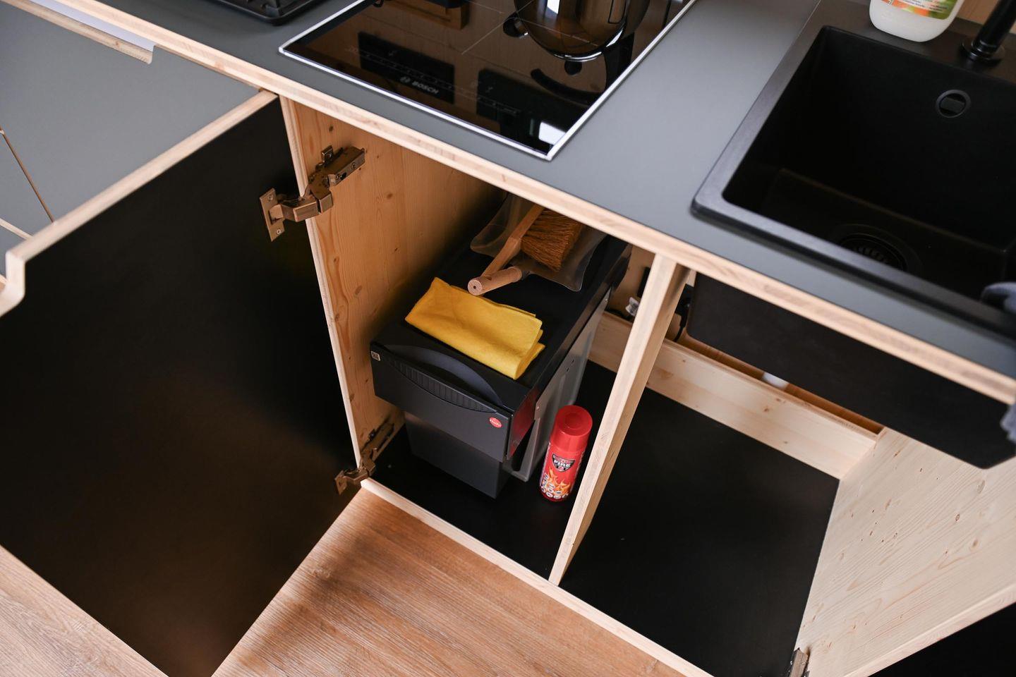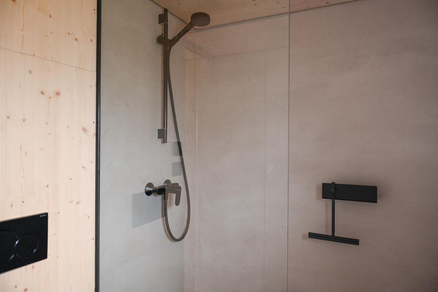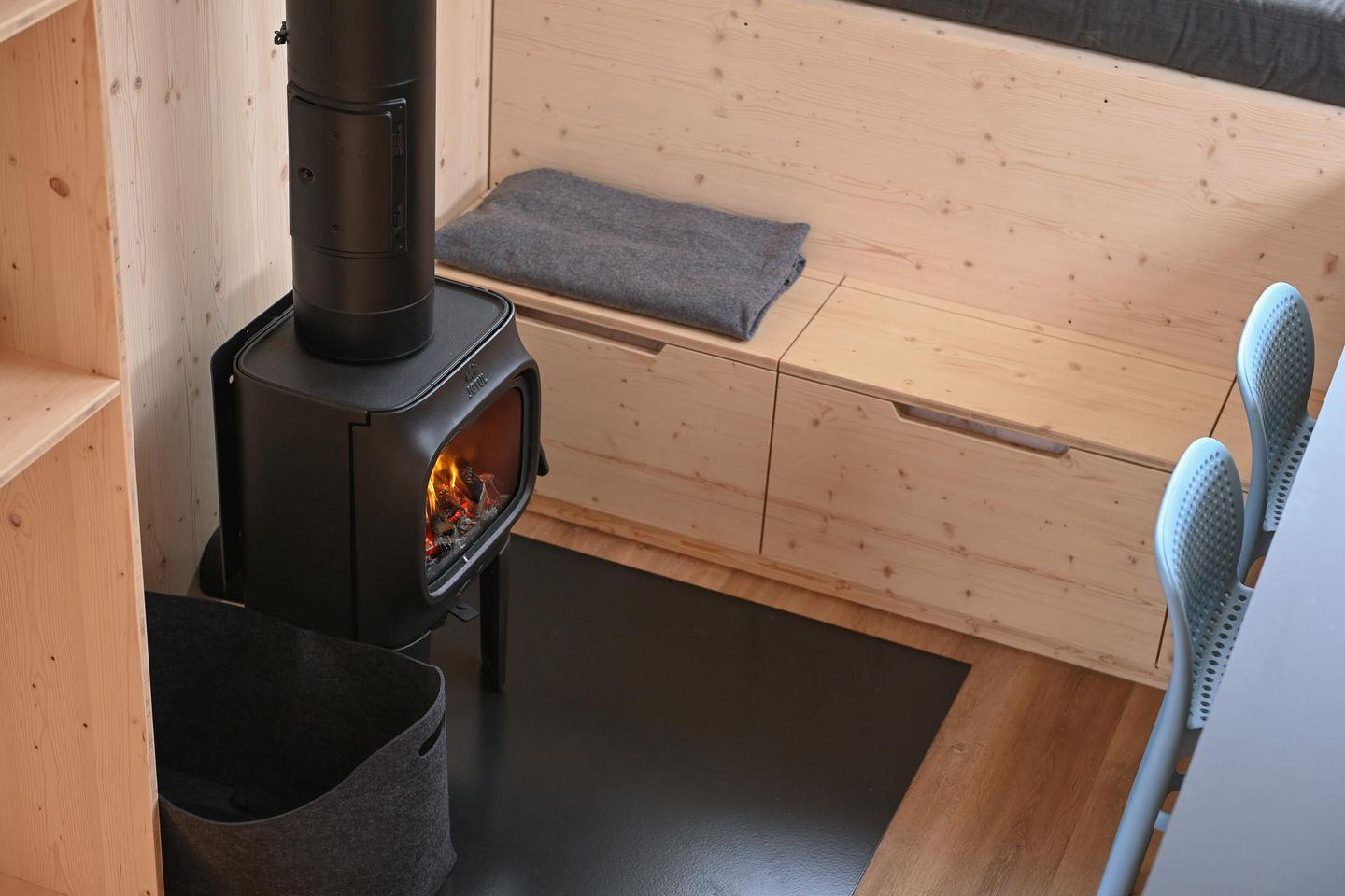 Im Tiny House findest du einen gemütlichen Wohnbereich mit Kaminofen (Holz bitte selbst mitbringen), einen hoch gelegenden Schlafbereich, eine moderne Küche sowie ein kleines, aber durchdachtes Bad mit bodentiefer Dusche. Der Loungebereich am Panoramafenster kann bei Bedarf in ein komfortables Zusatzbett (1,40 m breit) verwandelt werden. Das separate Sleep Space bietet ein weiteres Doppelbett (1,40 m), eine kleine Sitzbank mit Stauraum, Heizung und ein eigenes Panoramafenster mit Nordseeblick – ideal für ältere Kinder oder ein befreundetes Paar.