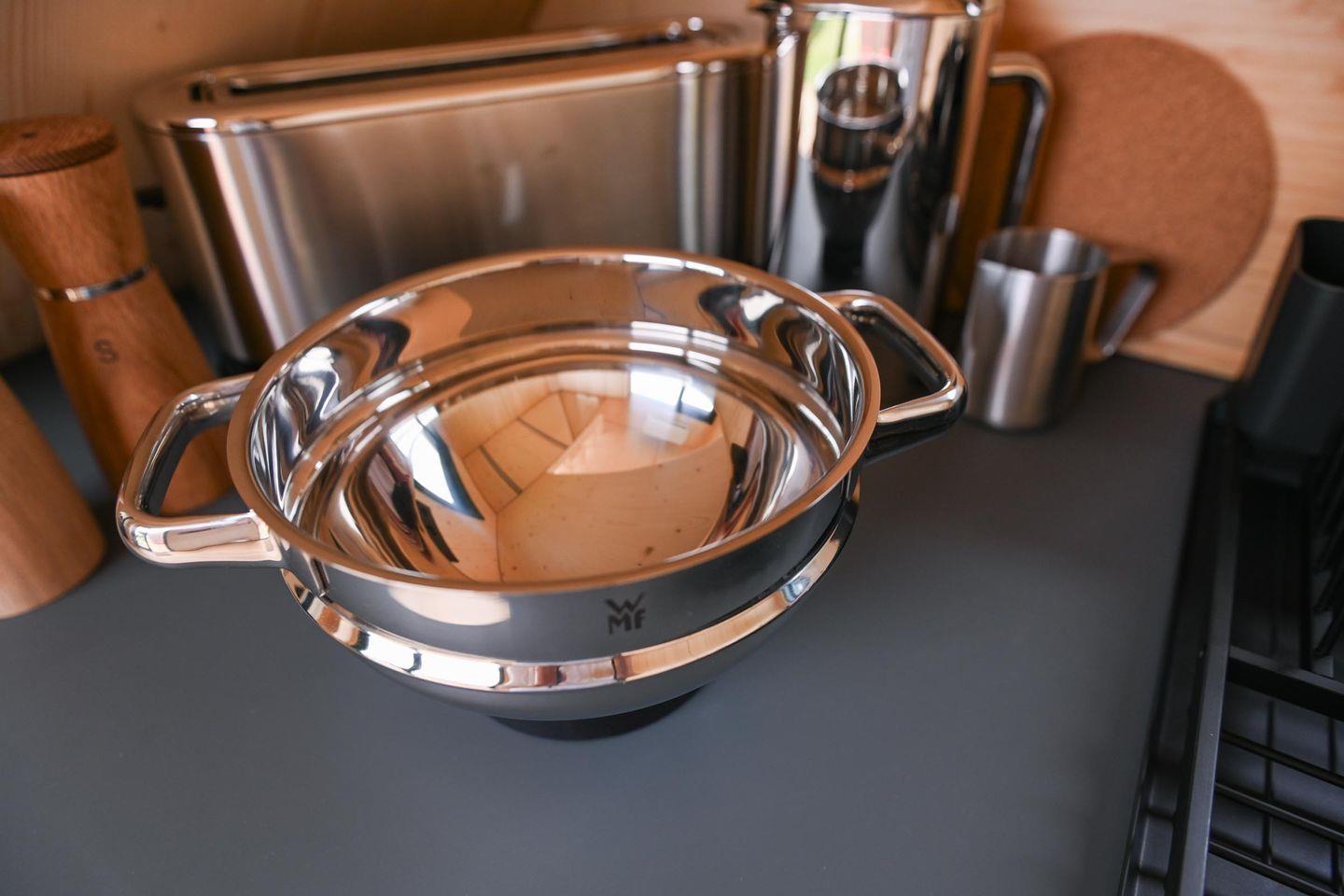 Die gemeinsame Terrasse verbindet Tiny House und Sleep Space nahtlos miteinander. Hier laden Bistro-Möbel zum Frühstück in der Morgensonne oder zum Sundowner nach einem Tag am Strand ein. Nachhaltigkeit wird auch hier großgeschrieben: Beide Gebäude stehen auf Trailern ohne Bodenversiegelung, sind wohngesund eingerichtet und gedämmt mit natürlicher Schafwolle – für ein gutes Gefühl beim Wohnen und Reisen.