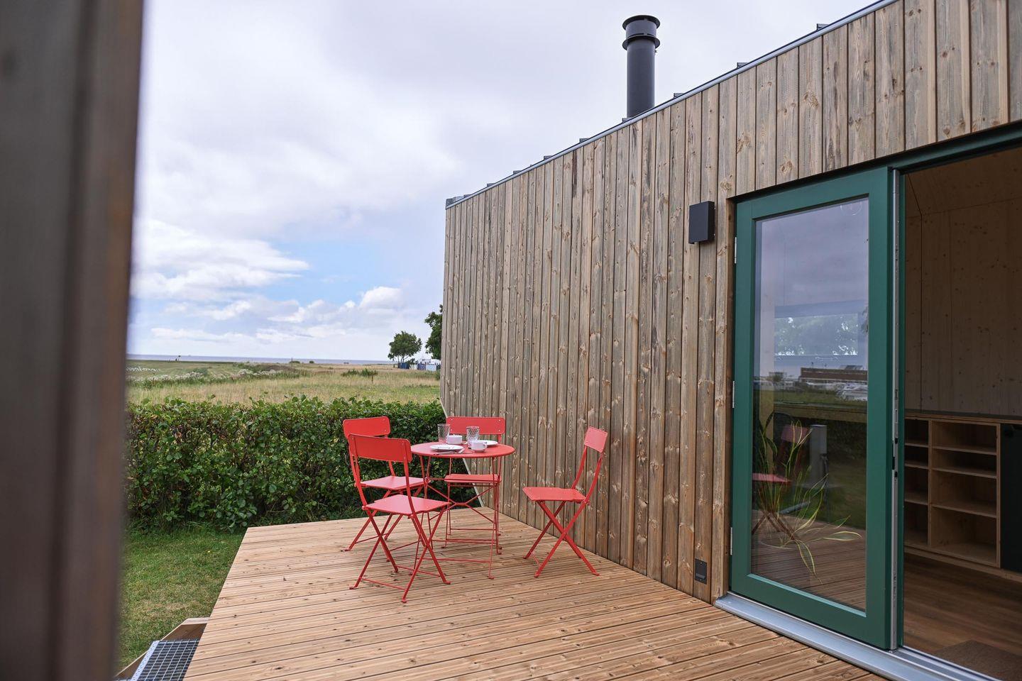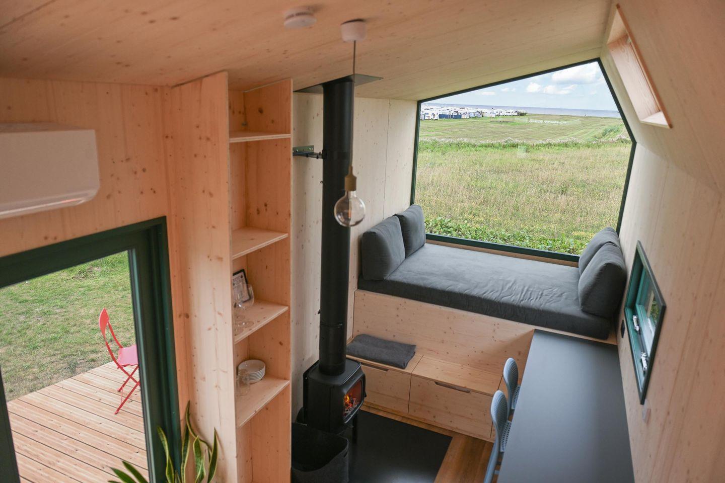 Das Herzstück bildet das Tiny House Pioneer, ein 22 qm großes Minihaus im skandinavischen Stil. Große Fensterflächen, ein durchdachtes Wohnkonzept und warme Naturmaterialien wie Schafwolle als Dämmung schaffen ein gesundes Raumklima mit Blick auf die Nordsee in der Ferne. Ergänzt wird es durch das Sleep Space – ein kleines, separat stehendes Cabin (5 qm), das über die gemeinsame Terrasse verbunden ist. Gemeinsam bilden die beiden Einheiten eine harmonische Unterkunft mit flexibler Nutzung.
