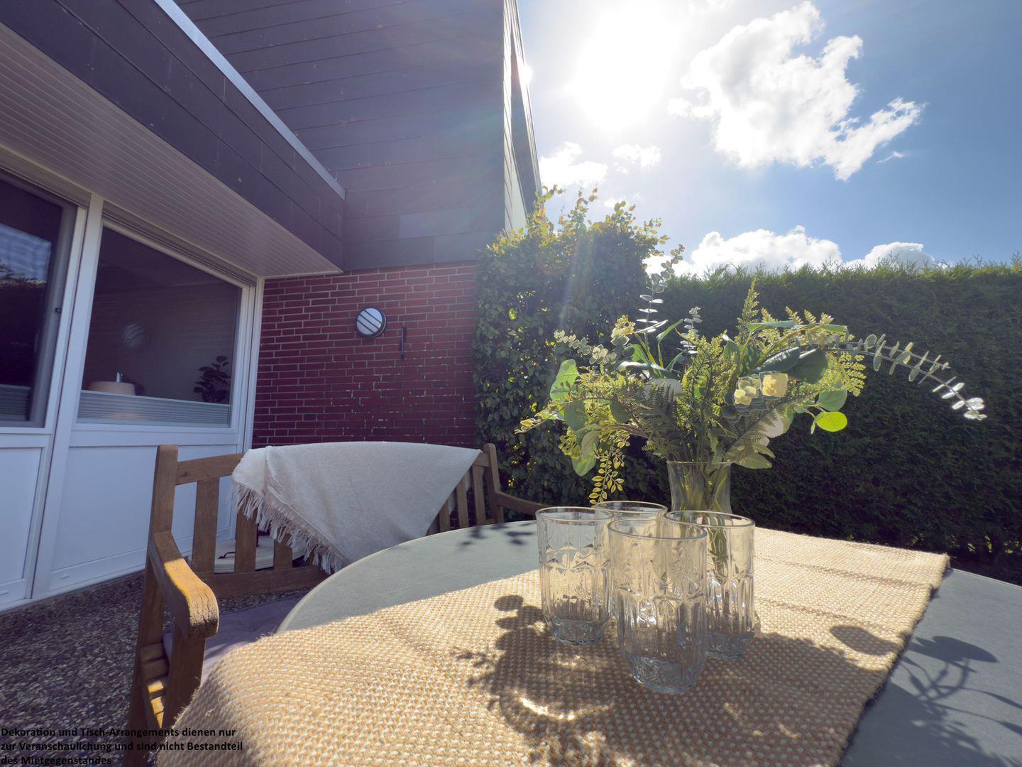 Die große Terrassentür öffnet den Blick auf den liebevoll angelegten Garten, der von einer grünen Hecke geschützt ist. Hier können Sie die Seele baumeln lassen, die Sonne genießen oder laue Sommerabende beim Grillen und einem Glas Wein ausklingen lassen.