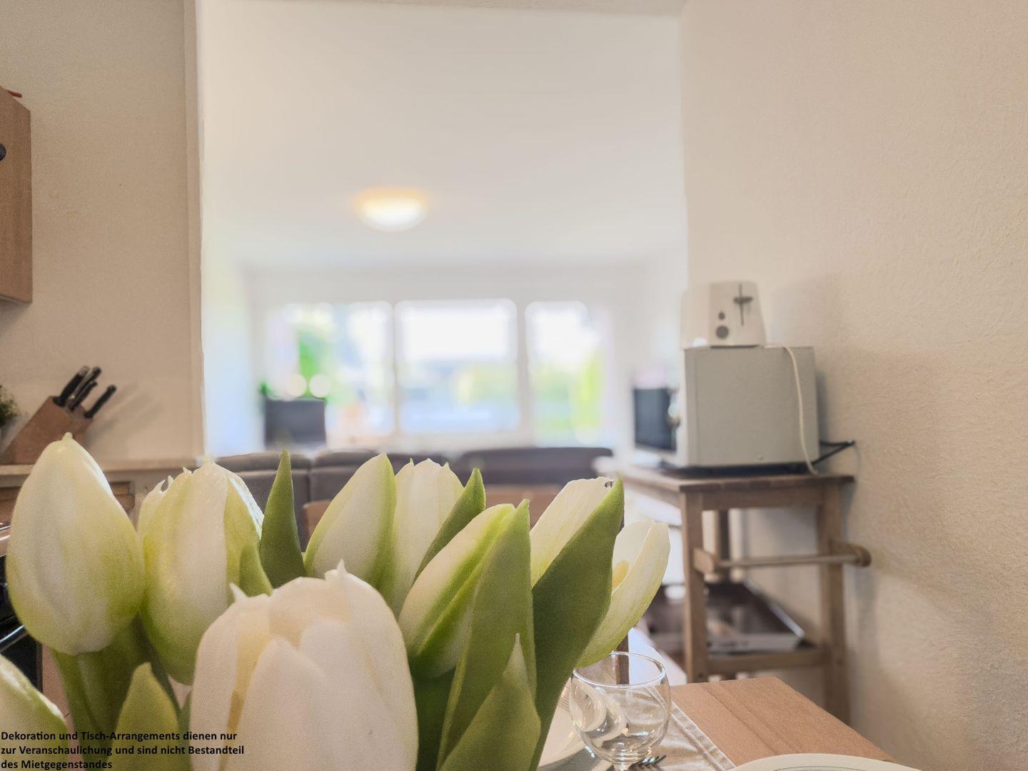 Die Küche verbindet praktische Ausstattung mit Gemütlichkeit. An der hellen Essgruppe kommen alle zusammen – für ein schnelles Frühstück oder ein liebevoll zubereitetes Abendessen. Alles, was Sie für Ihre Selbstversorgung benötigen, steht bereit, damit Sie sich rundum wohlfühlen.