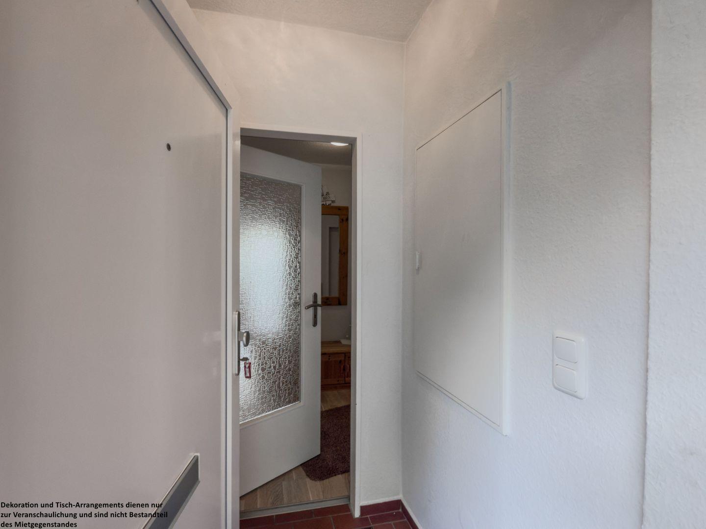 Der freundliche Flur heißt Sie willkommen: Garderobe, Schuhschrank und ein großer Spiegel begleiten Sie auf dem Weg hinaus zu ausgedehnten Strandspaziergängen oder gemütlichen Nachmittagen im Garten.