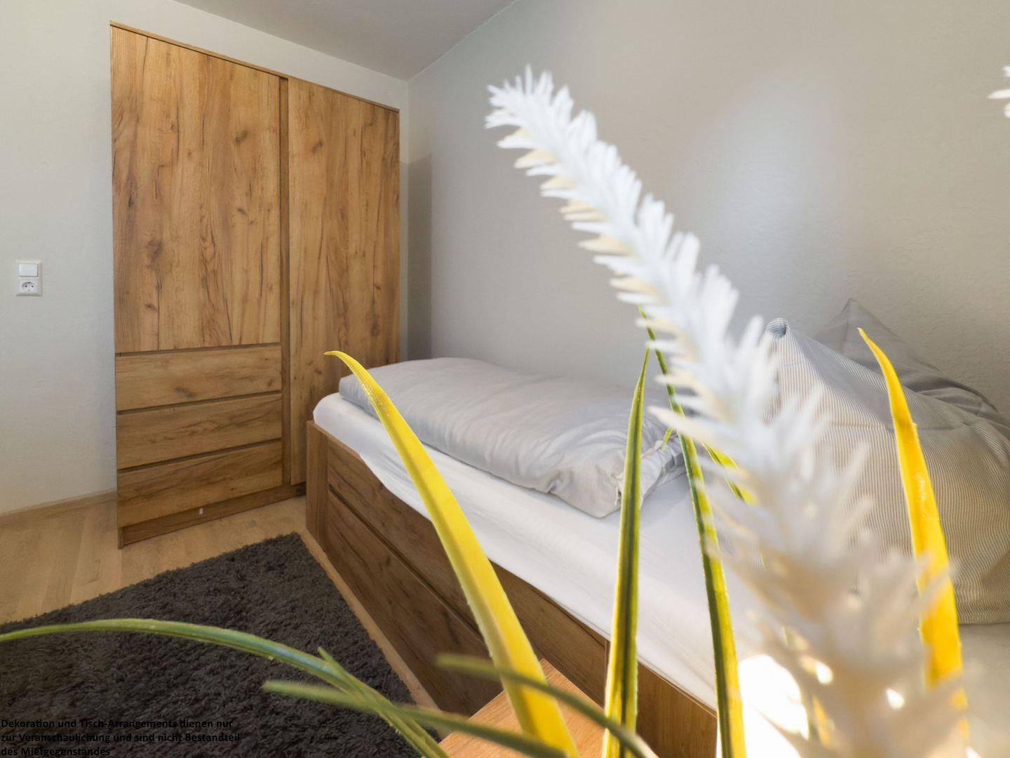Das zweite Schlafzimmer mit zwei Einzelbetten eignet sich perfekt für Kinder, Freunde oder weitere Familienmitglieder und spiegelt die gemütlichen, warmen Töne der Wohnung wider.