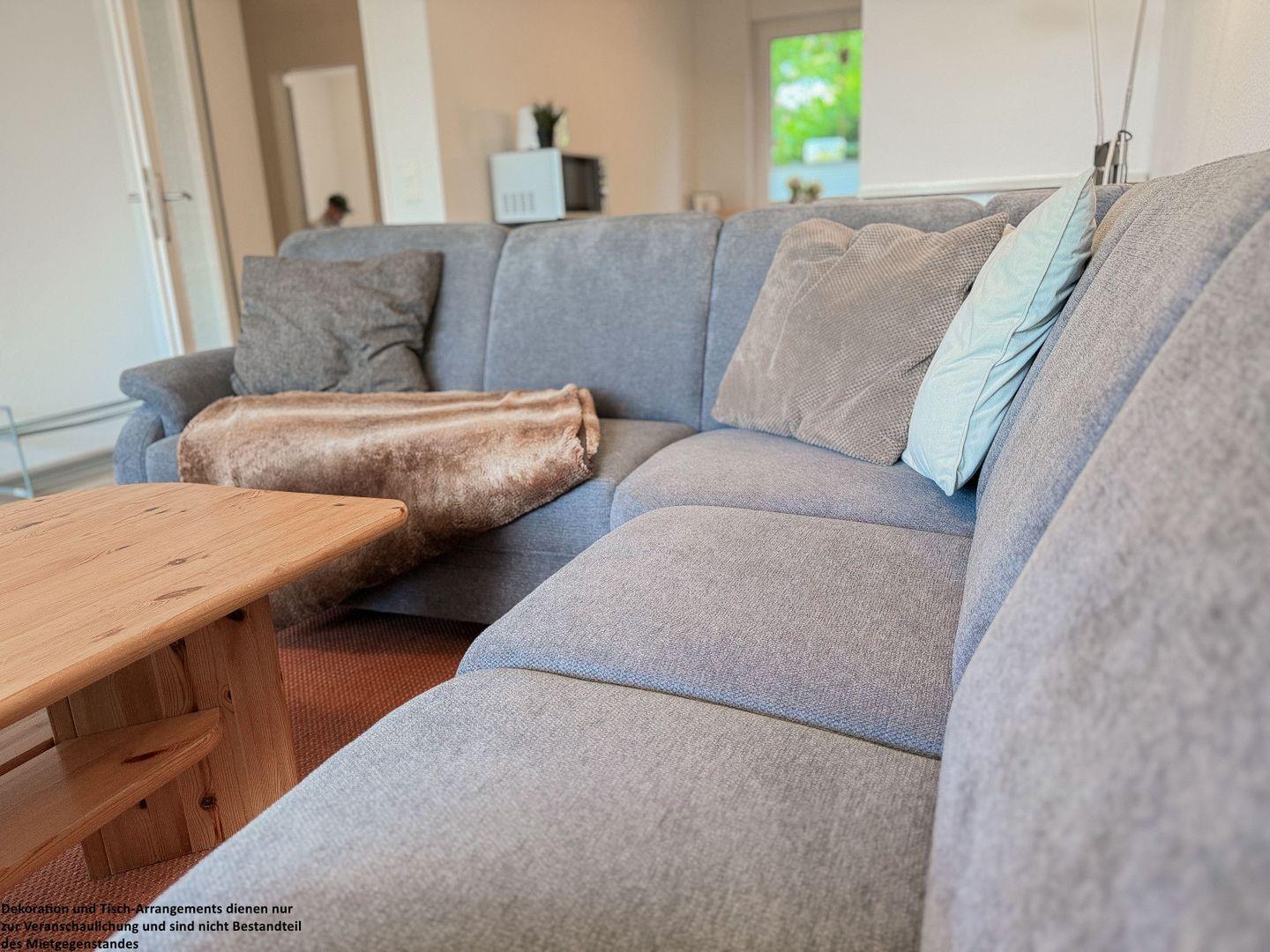 Im Wohnzimmer schlägt das Herz der Wohnung. Eine bequeme Couch lädt zum Entspannen ein – sei es beim Lesen, Spielen oder einfach beim Ausruhen nach einem Tag am Meer.