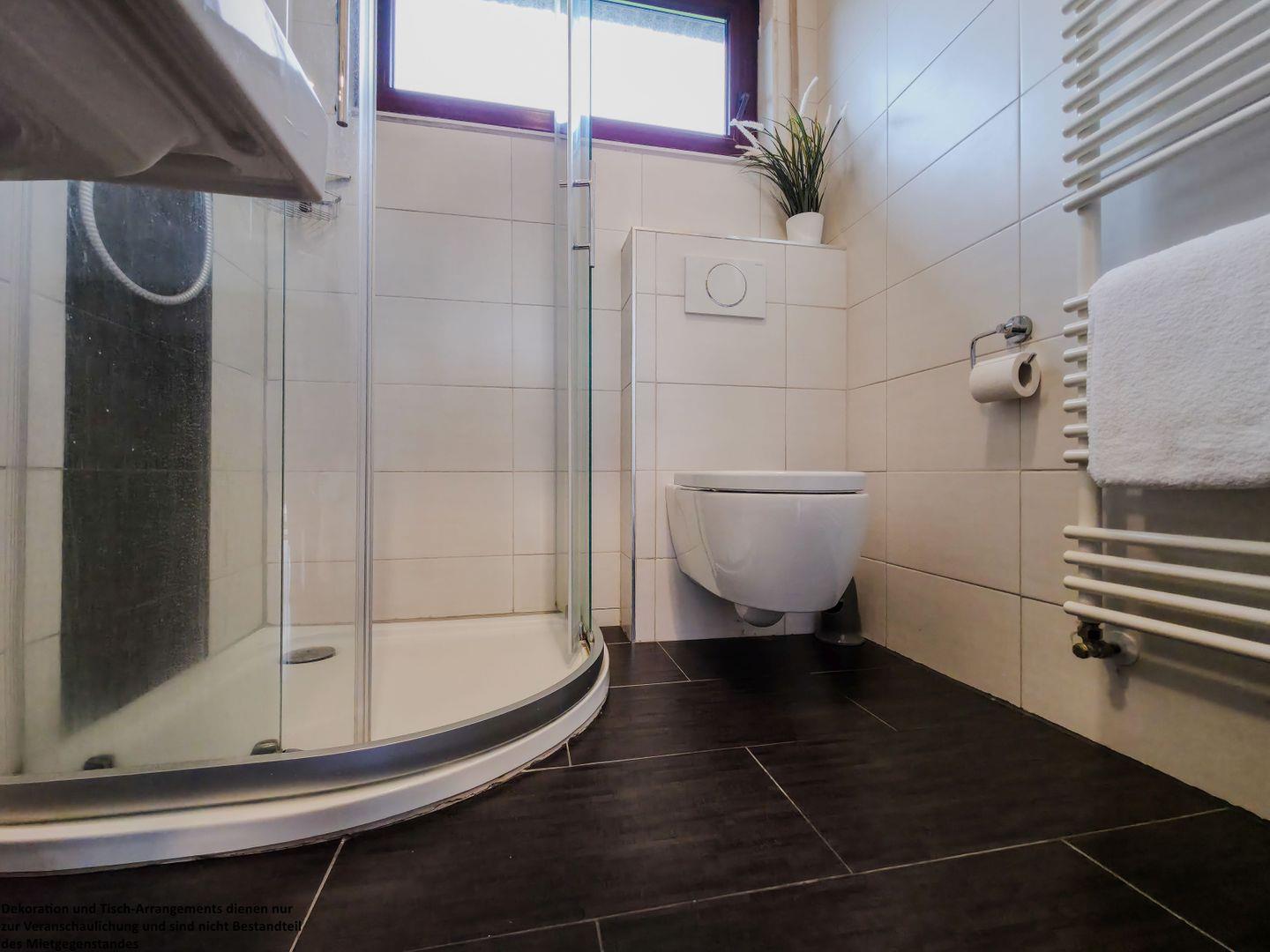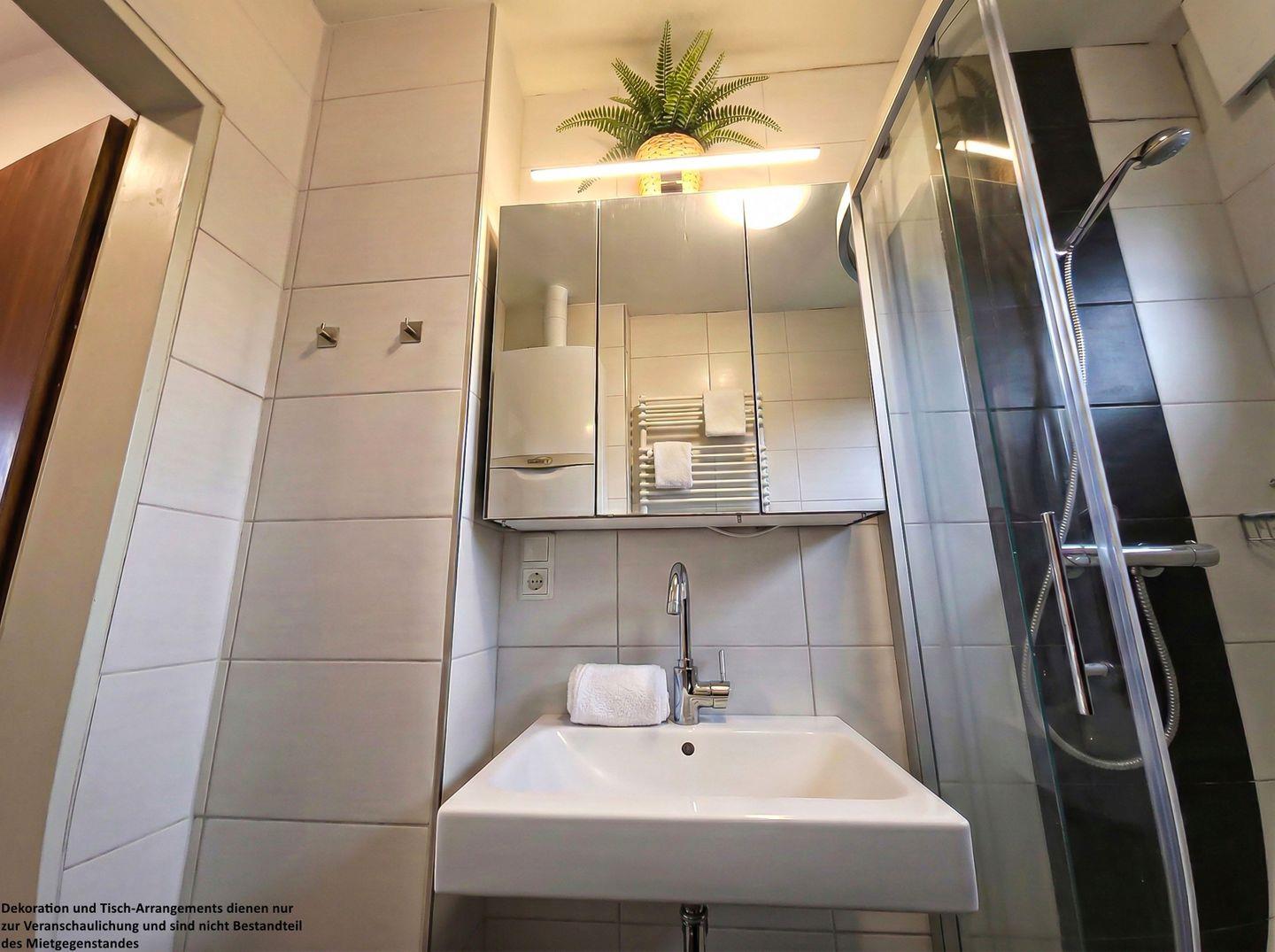 Das helle, tageslichtdurchflutete Badezimmer, das Sie ebenfalls über den Flur erreichen, ist freundlich gefliest und verfügt über eine Duschwanne sowie einen Spiegelschrank mit ausreichend Stauraum.