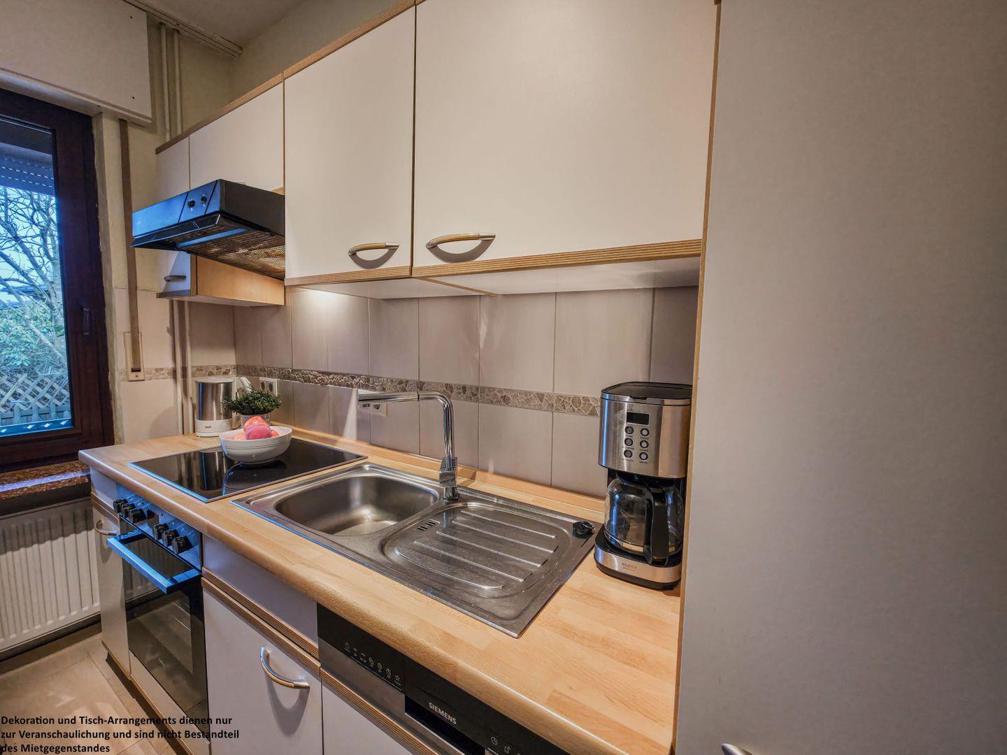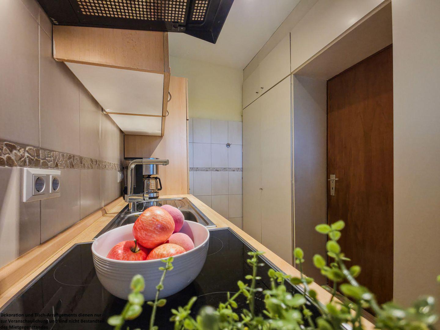 Ebenfalls vom Wohnbereich aus erreichbar ist die praktische Küchenzeile, die für die Selbstversorgung gut ausgestattet ist. Hier macht Kochen auch im Urlaub Freude. Die warmen Holzdecken im gesamten Wohnbereich sorgen zusätzlich für eine behagliche und wohnliche Atmosphäre.