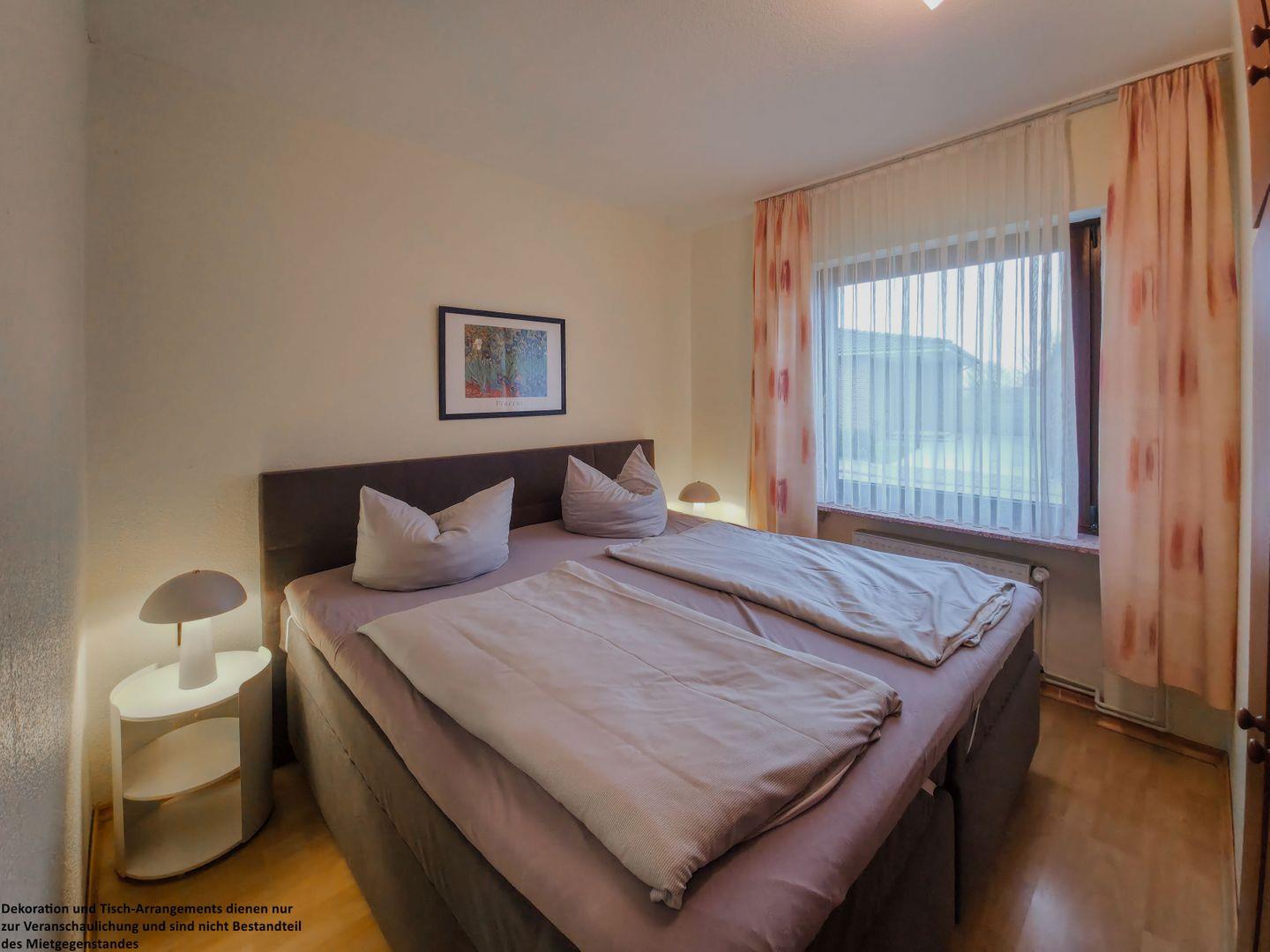 Das erste Schlafzimmer ist mit einem komfortablen Boxspringbett ausgestattet und bietet dank des eingebauten Kleiderschranks viel Platz für Ihre Urlaubsgarderobe.