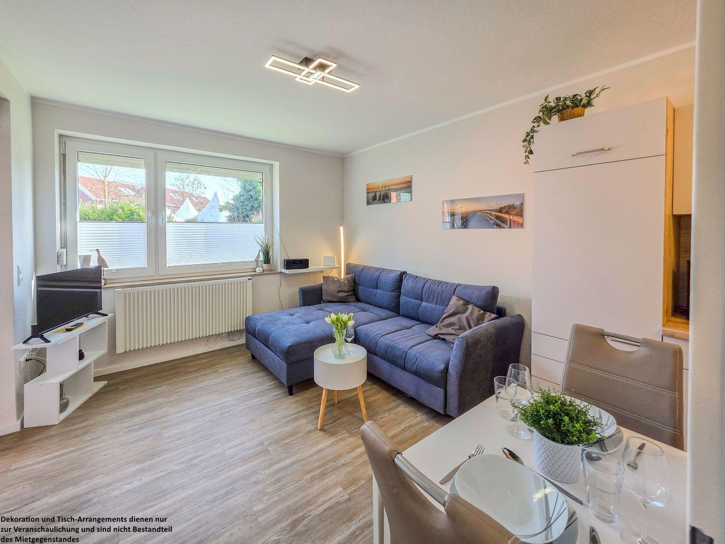 Die Wohnung befindet sich im Erdgeschoss eines Mehrfamilienhauses und besticht durch ihre helle, freundliche sowie moderne Einrichtung. Das geräumige Wohnzimmer mit gemütlichem Schlafsofa lädt zu entspannten Abenden ein – ideal für gemeinsame Stunden nach einem erlebnisreichen Tag.