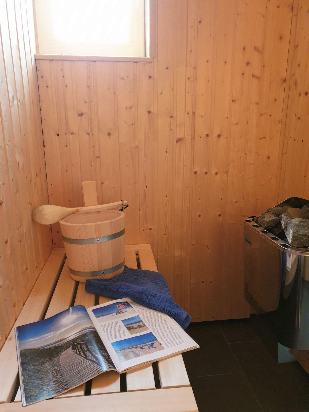 Eine Sauna, eine ebenerdige Dusche und eine Badewanne bieten den nötigen Komfort zur Erholung.