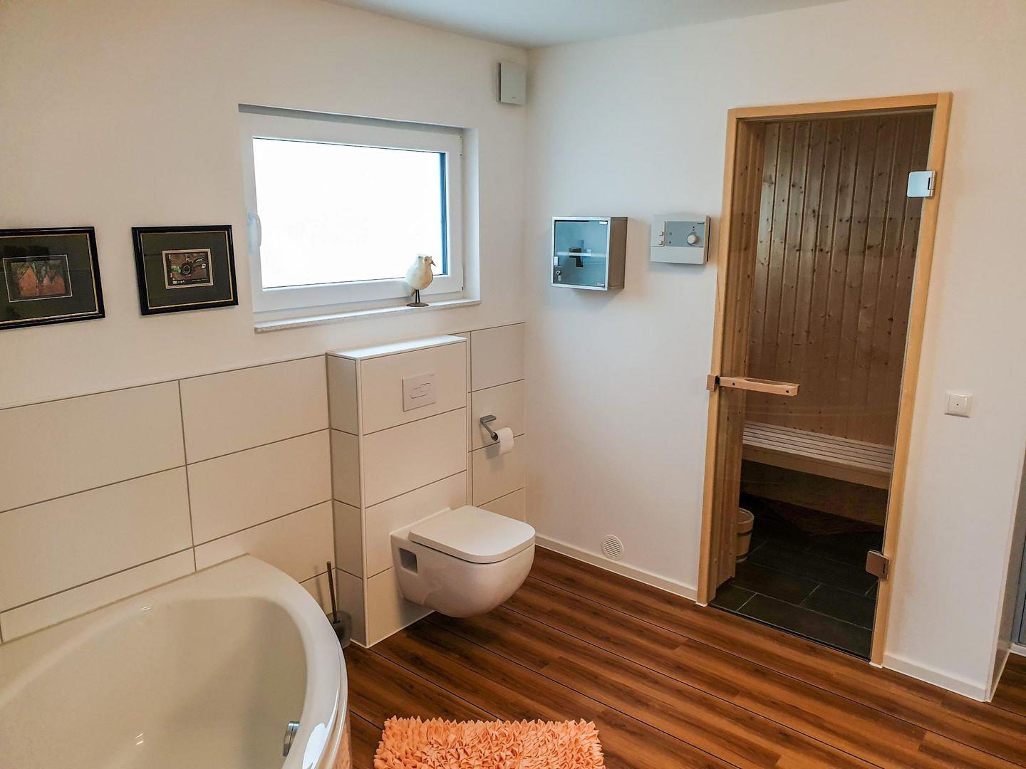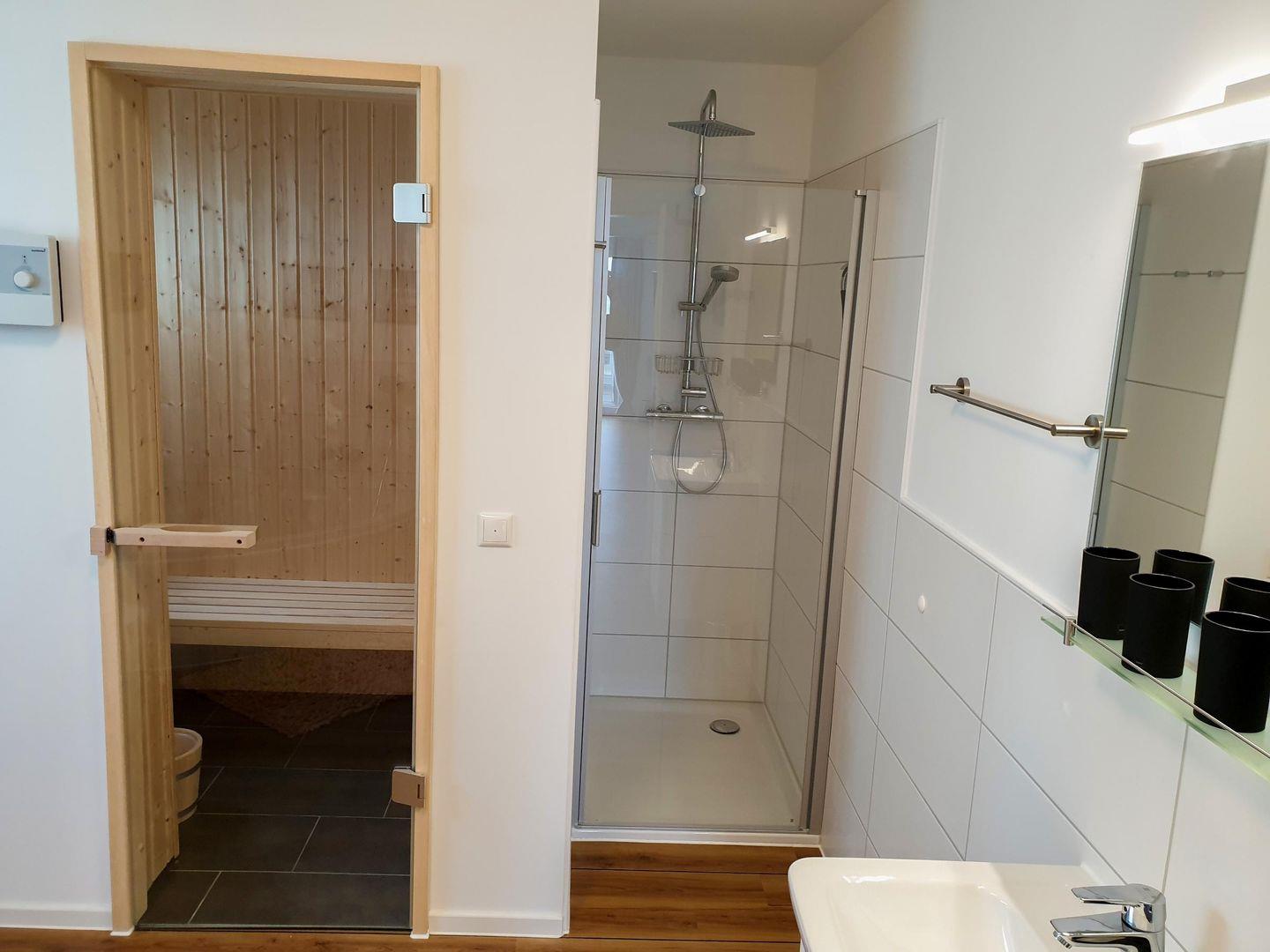 An stürmischen und/oder regnerischen Tagen wird das Badezimmer mit seiner Vollausstattung zum Wellnesstempel. Eine Sauna, eine Regendusche und eine Badewanne bieten den nötigen Komfort zum Relaxen. Eine Fußbodenheizung im gesamten Apartment vermittelt wohlige Wärme an kühlen Tagen.