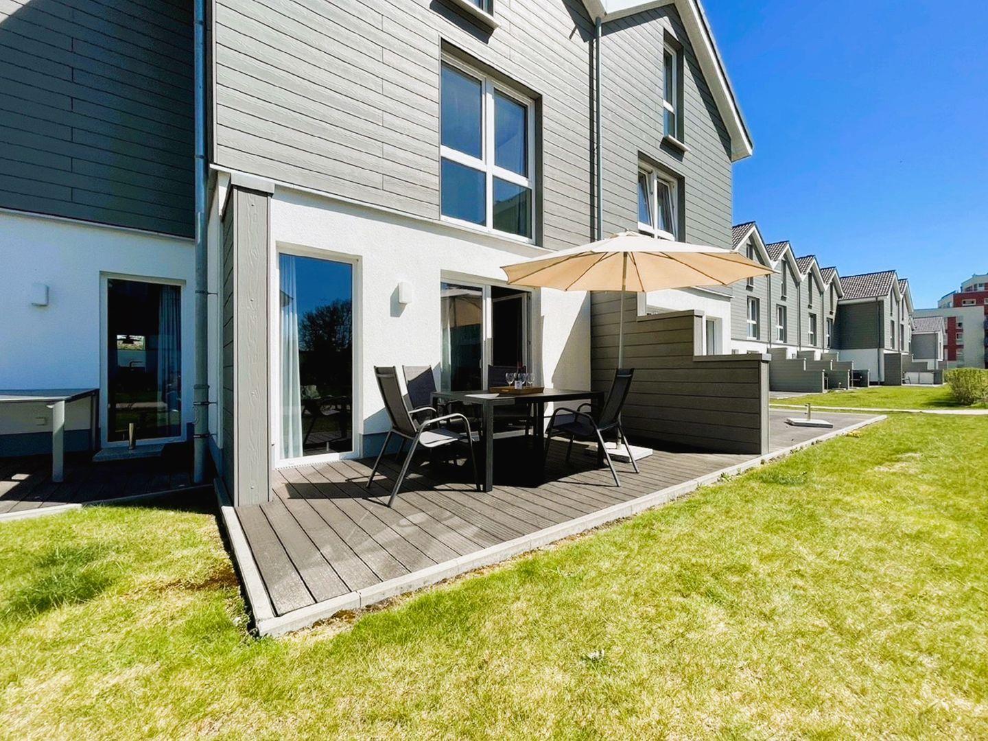 Die Süd-Terrasse ist mit einem Tisch und sechs Sitzgelegenheiten sowie einem Sonnenschirm möbliert.