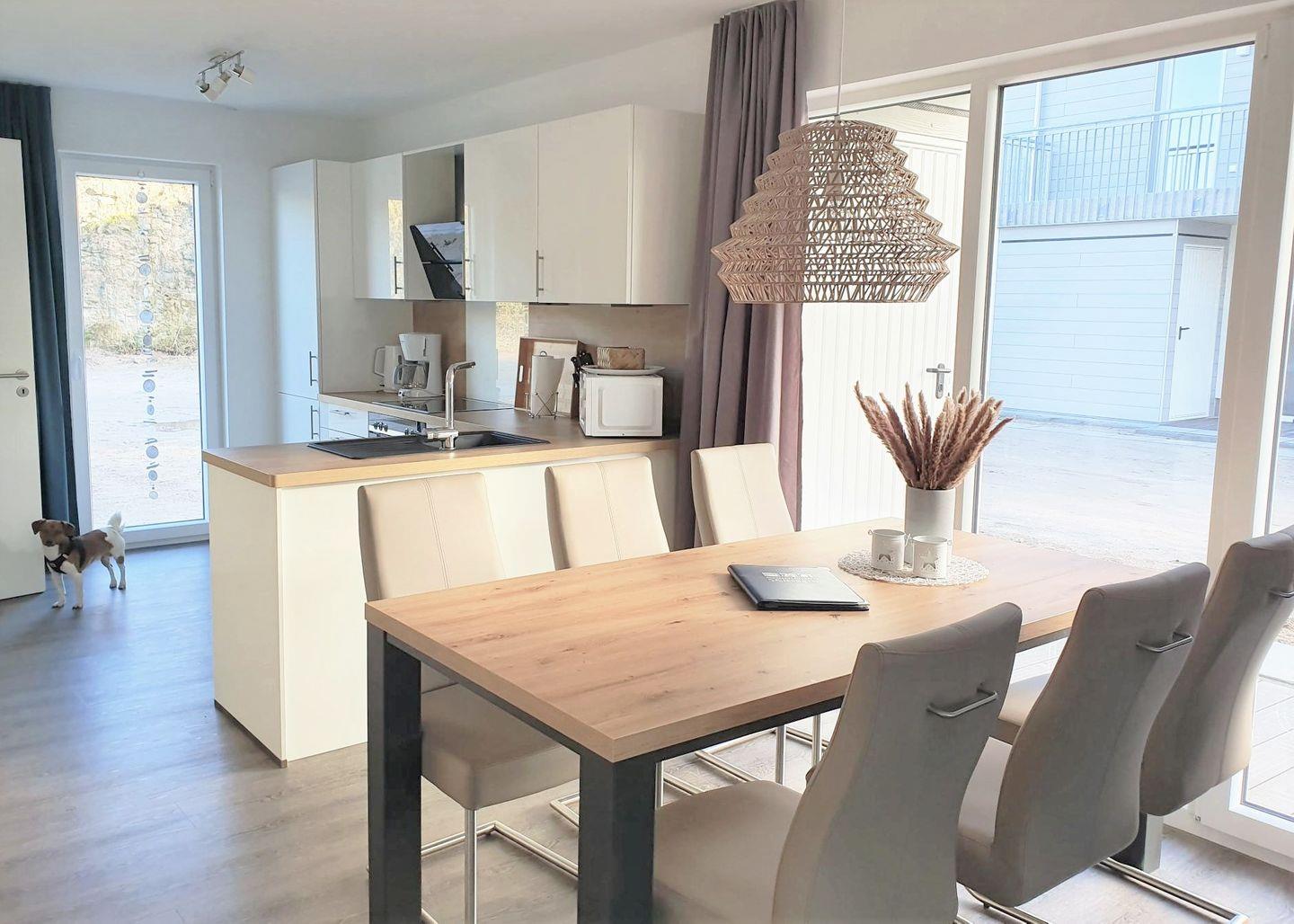 Die Küche ist offengehalten und mit einer hochwertigen Einbauküche inklusive Mikrowelle ausgestattet.