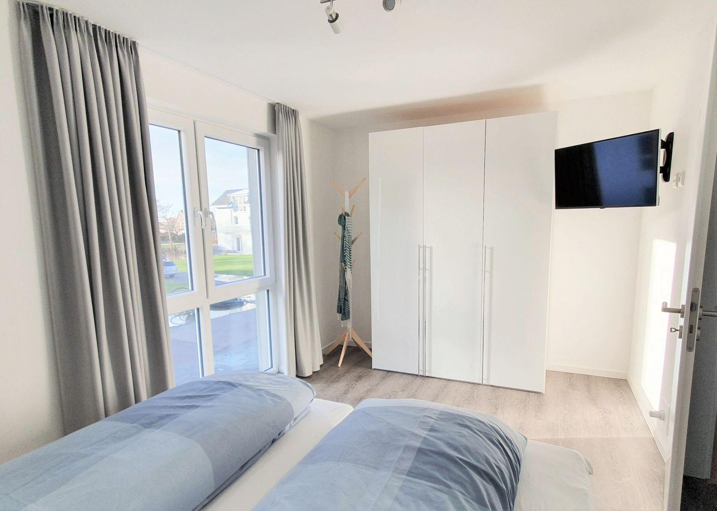 Ein Schlafzimmer ist mit einem weiteren Fernseher ausgestattet.