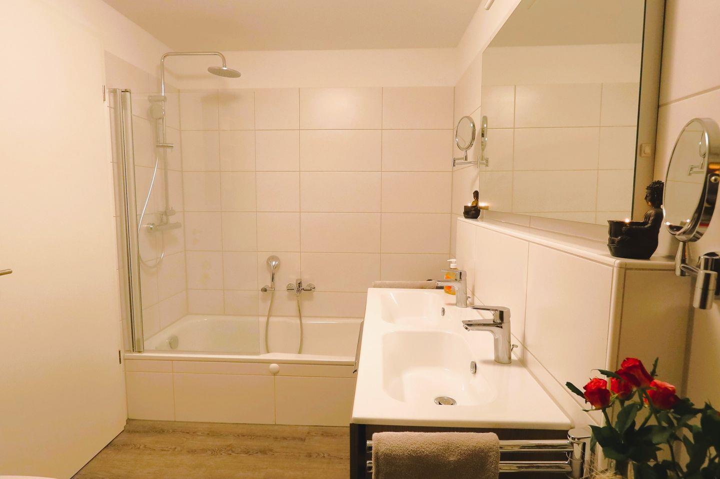 Im OG finden Sie ein Schlafzimmer mit Doppelbett (180x200) und Smart-TV, ein Schlafzimmer mit zwei Einzelbetten (90x200), sowie das großzügige, moderne Bad mit Badewanne inkl. Regendusche, einer separaten Regendusche, einem Doppelwaschtisch und einer Sauna.
