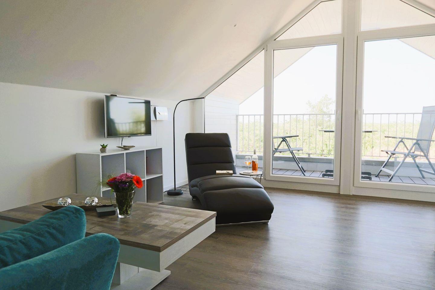 Im DG befindet sich das dritte Schlafzimmer mit Doppelbett (180x200), sowie die großzügige Lounge mit Couch, Relax-Liege und Smart-TV. Über die Lounge haben Sie Zugang zu dem Balkon mit einem wunderschönen Blick auf die Nordsee und dem Wattenmeer.
