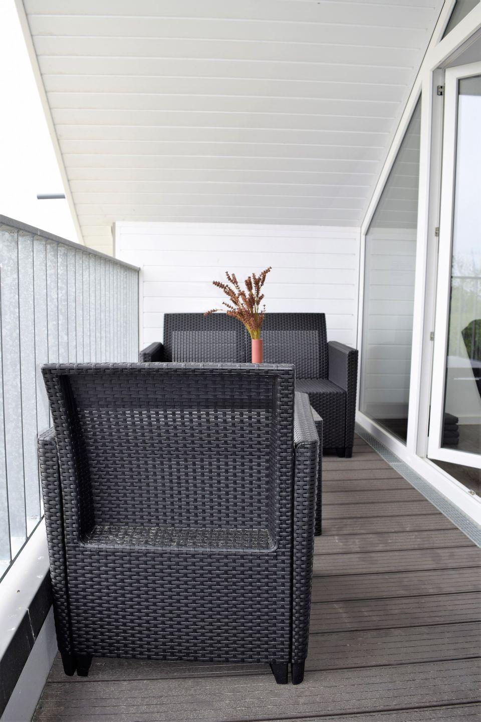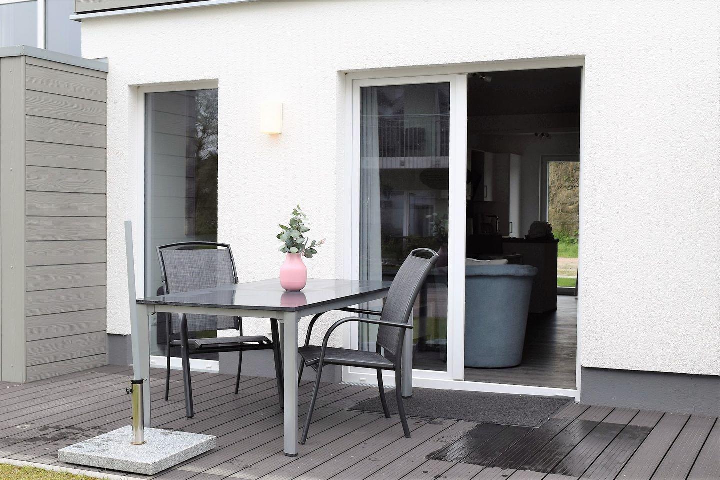 Die Süd-Terrasse ist mit einem Tisch und sechs Sitzgelegenheiten sowie einem Sonnenschirm möbliert.