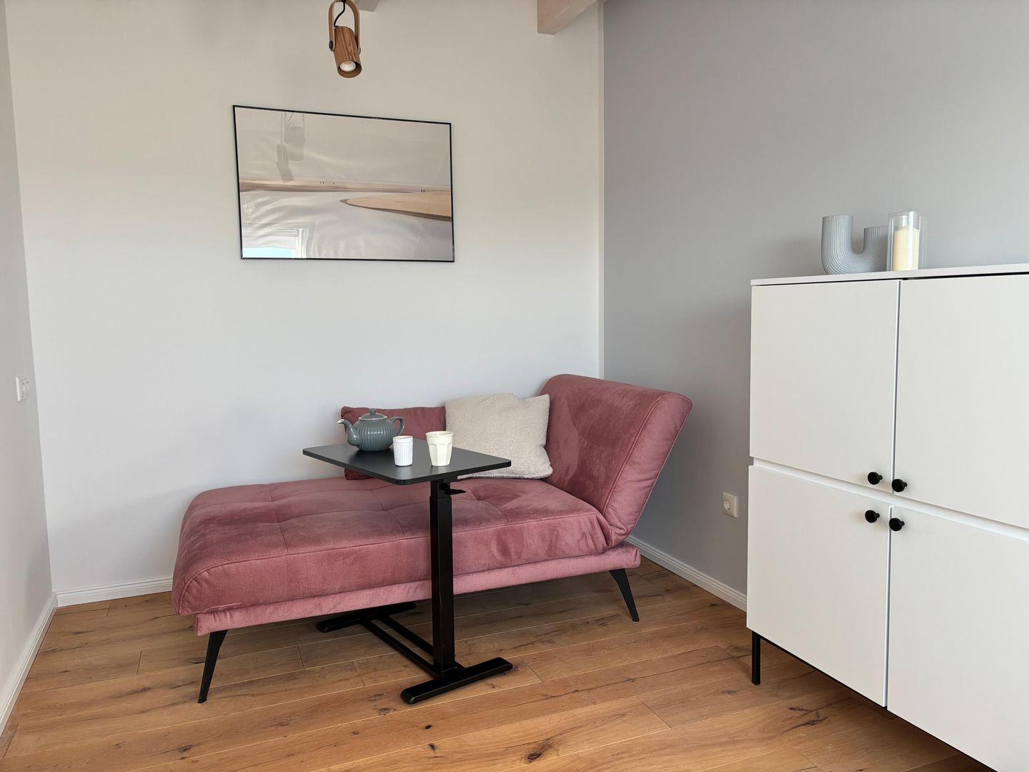 Gulfhof Wangermeer Whg 4 Hygge, freistehend, 2025 gemütliche Maisonette Wohnung (78 m²) für bis zu 5 Personen mit 2 Schlafzimmern, ein Bad mit Badewanne plus Gäste-WC. Offene Küche zum Wohnzimmer mit Induktion, Backofen, Spülmaschine und Nespresso. Sauna zur Eigennutzung, Spielzimmer, Terrasse, Garten mit Grill und Gartenmöbeln. Allergikergeeignet, Nichtraucher, WLAN ab 100 Mbit/s, Parkplatz & E-Ladestation. See 700 m.