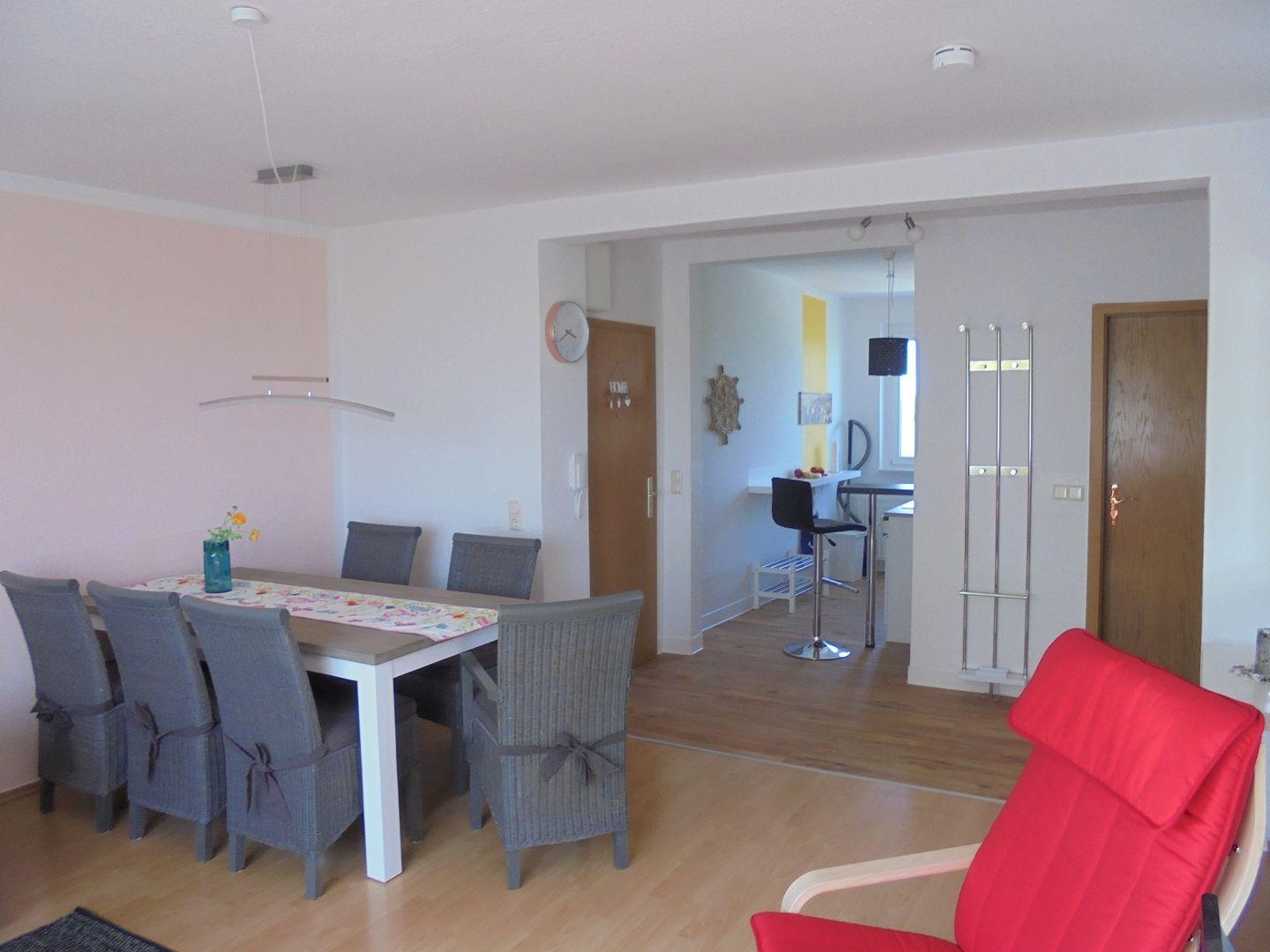 Die Ferienwohnung Schöne Aussicht im Dorf Wangern bietet auf 60 m² Platz für bis zu fünf Personen, einschließlich eines Kinderbetts. Zur Ausstattung gehören eine offene Küche mit Spülmaschine, ein Wohnzimmer, WLAN, eine Terrasse mit Gartenmöbeln sowie ein Garten mit Spielplatz. Genießen Sie den außergewöhnlich guten Landschaftsblick.