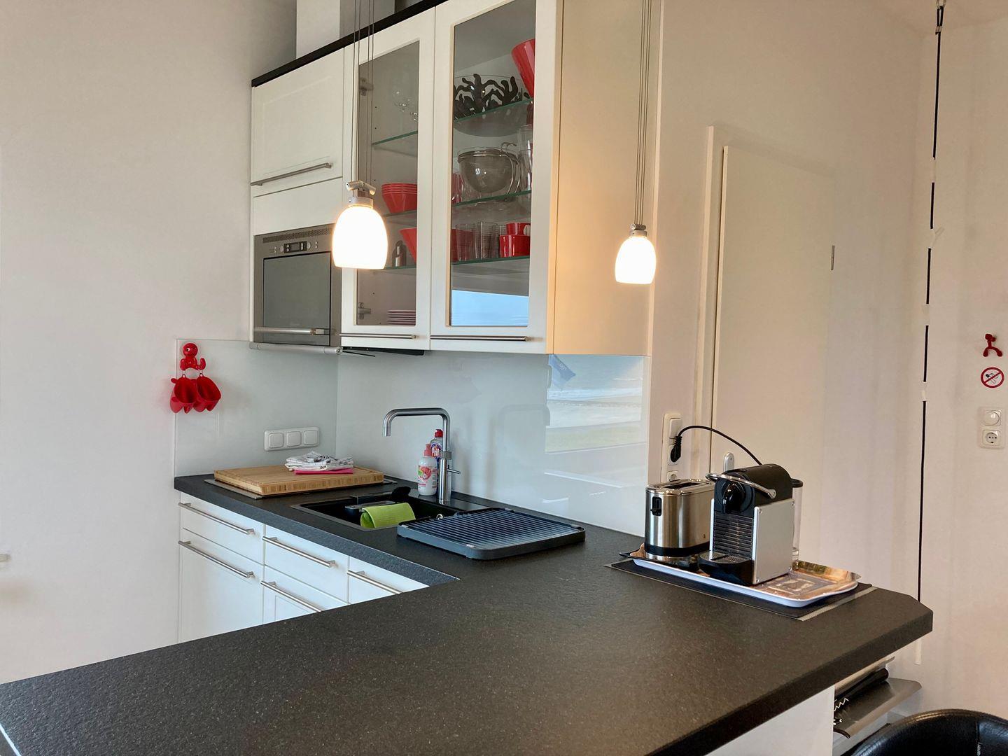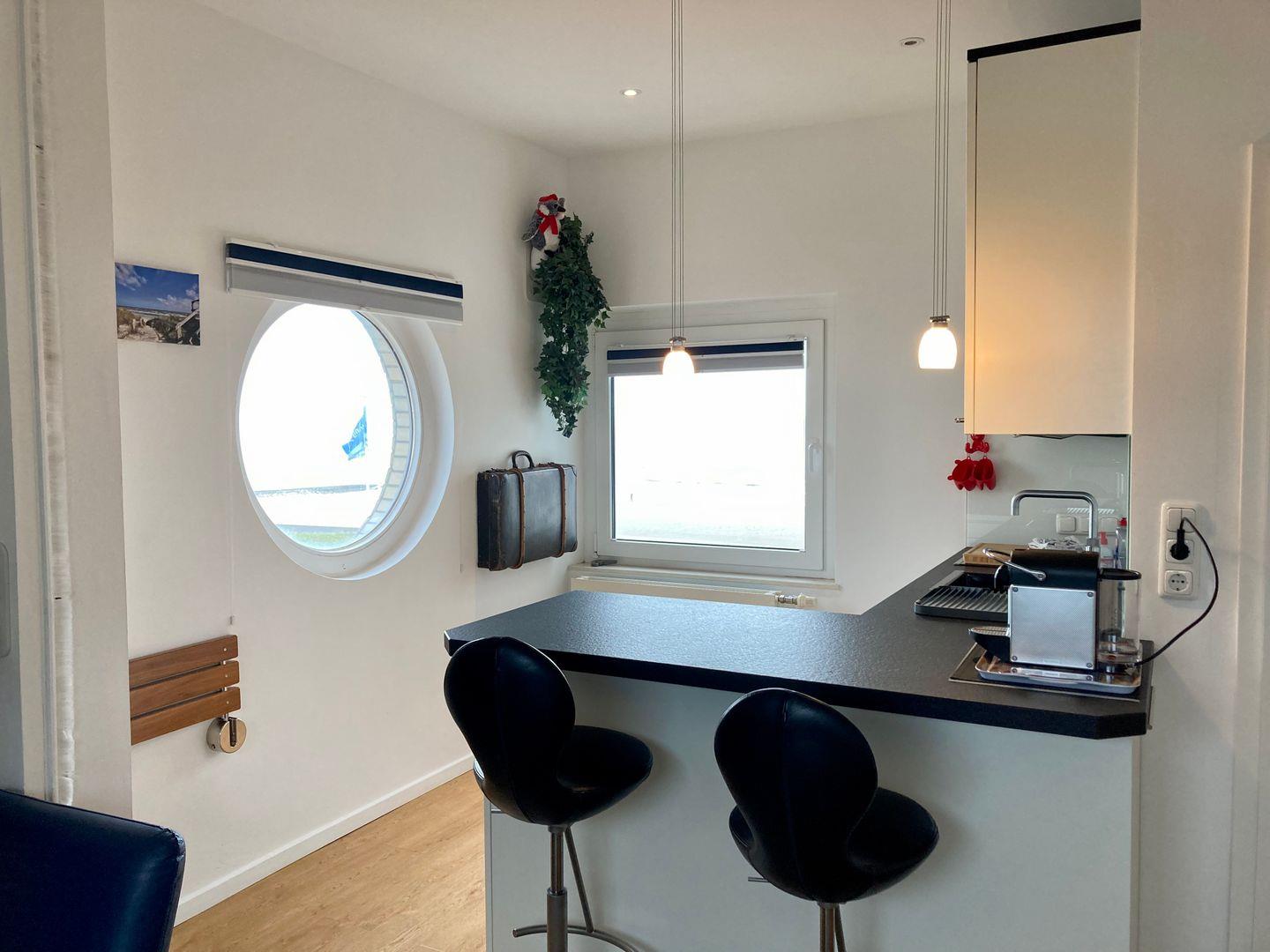 Das Bett lässt sich elektrisch unter die Decke fahren, so dass ein gemütlicher Wohnbereich entsteht. Die Küche ist auch mit allem ausgestattet, was Sie für eine bequeme Selbstverpflegung brauchen. Beim Kochen können SIe den Blick aufs Meer schweifen lassen!