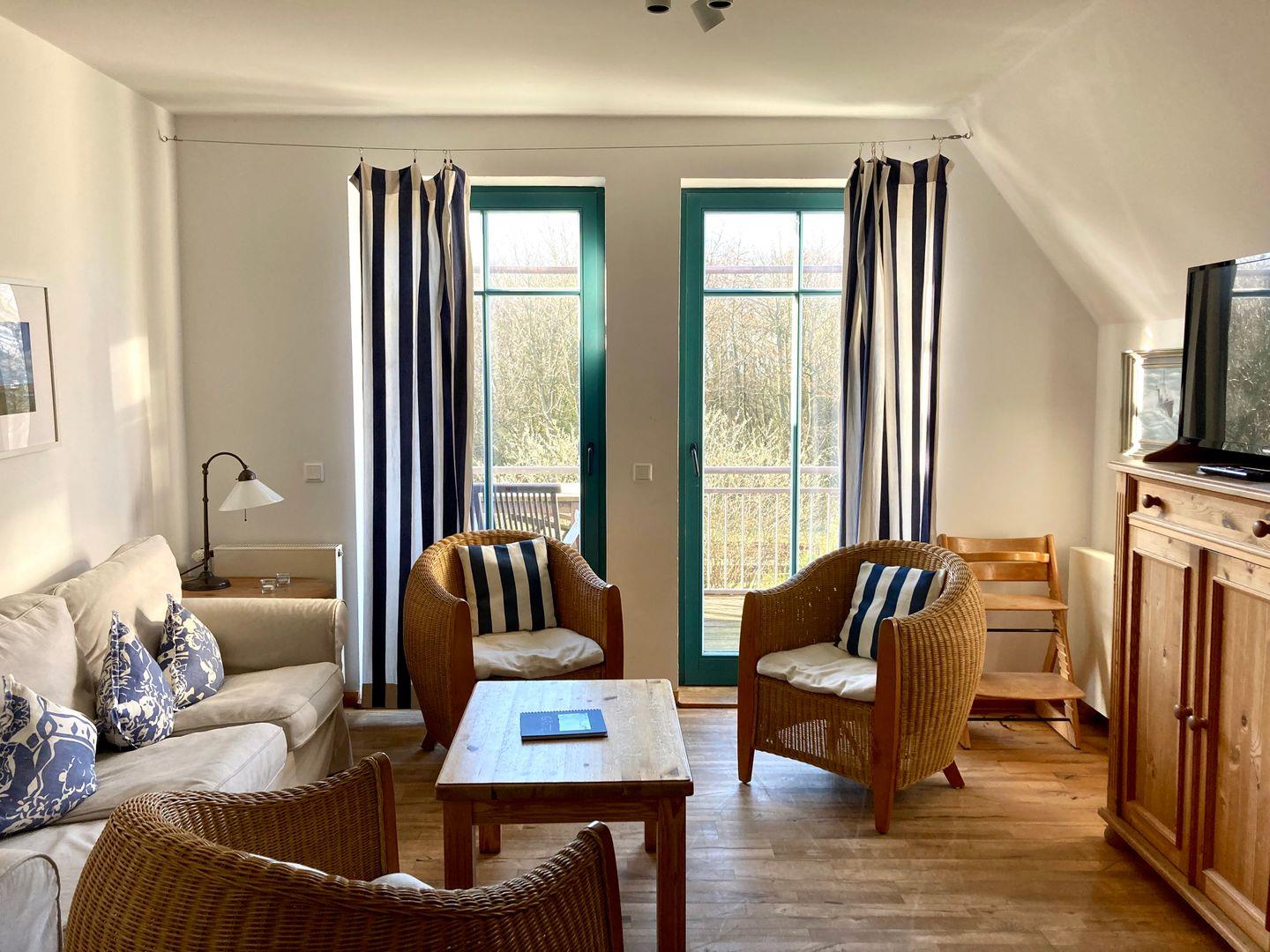 Vom gemütlichen Wohn-/Essbereich gelangen Sie auf den 1. Balkon, mit Blick ins Grüne, Richtung Deich. Die Küche verfügt über alles, was Sie für eine bequeme Selbstverpflegung benötigen