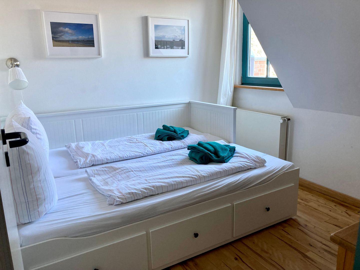 In der nächsten Ebene befindet sich dann ein Schlafzimmer mit 2 Einzelbetten, wobei 1 Bett nur eine Länge von 1,6m hat