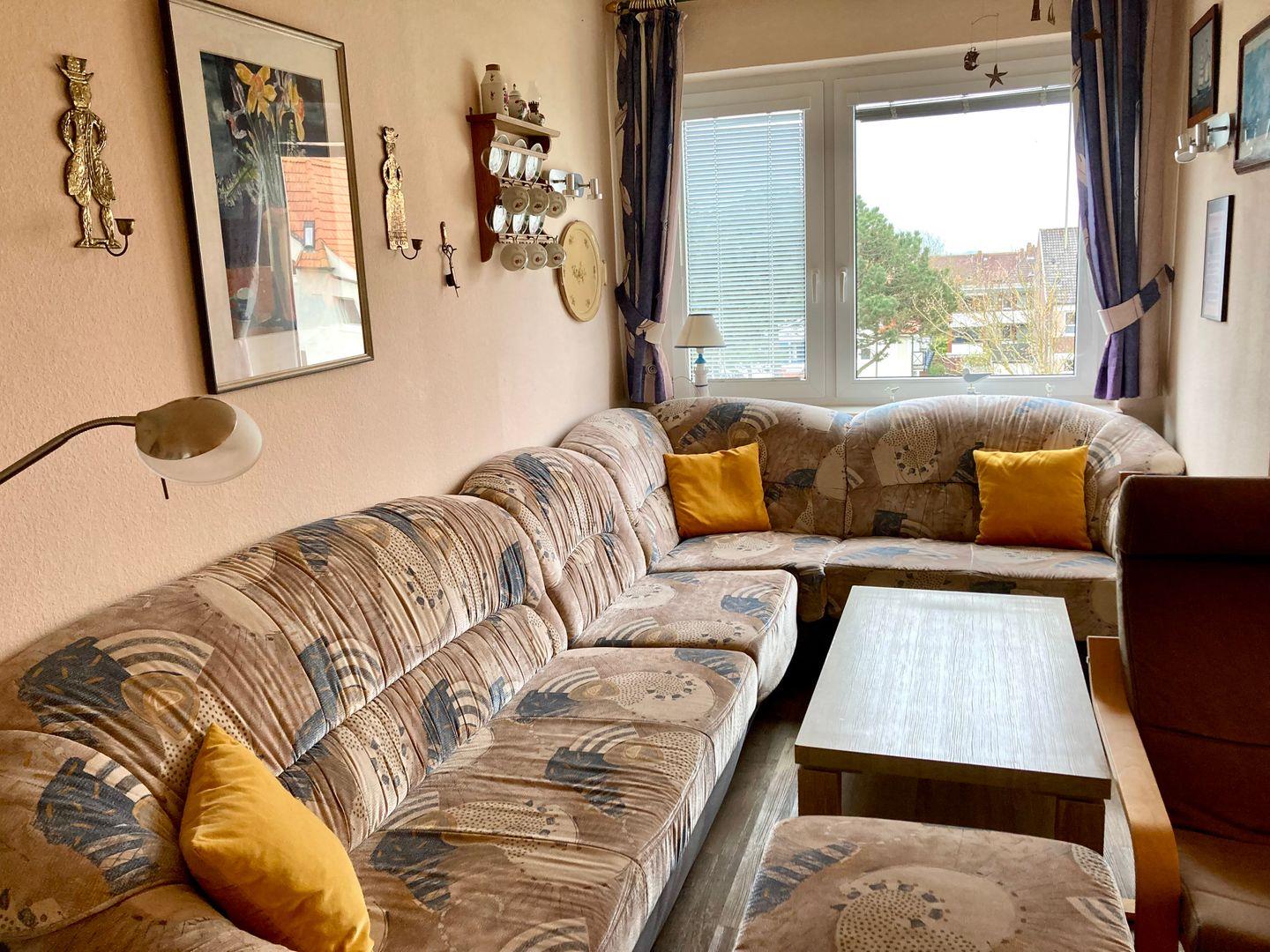 Das helle Wohnzimmer mit Sofa lädt zum Verweilen ein und der Südbalkon lässt sogar auf das Wattenmeer blicken.