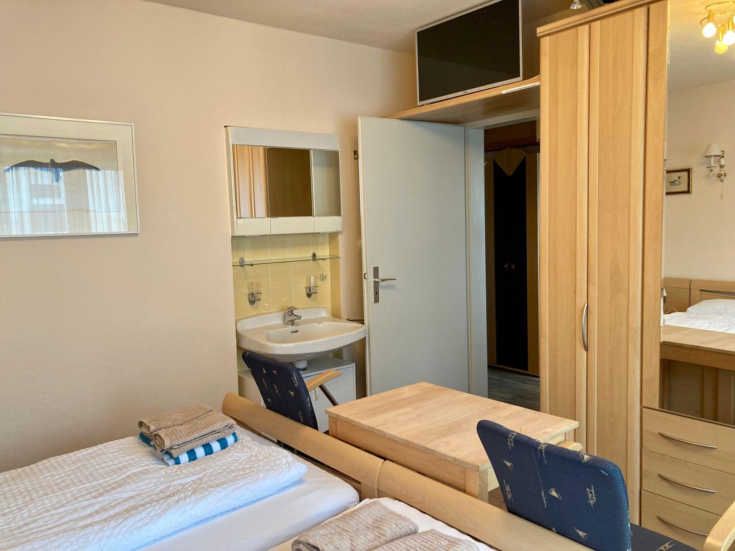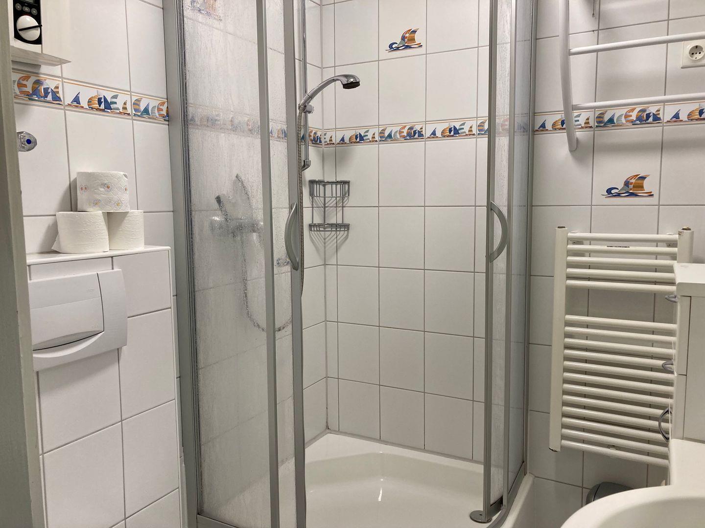 Das Badezimmer wurde erst vor wenigen Jahren modernisiert und verfügt eine Eckdusche und Handtuchtrockner.