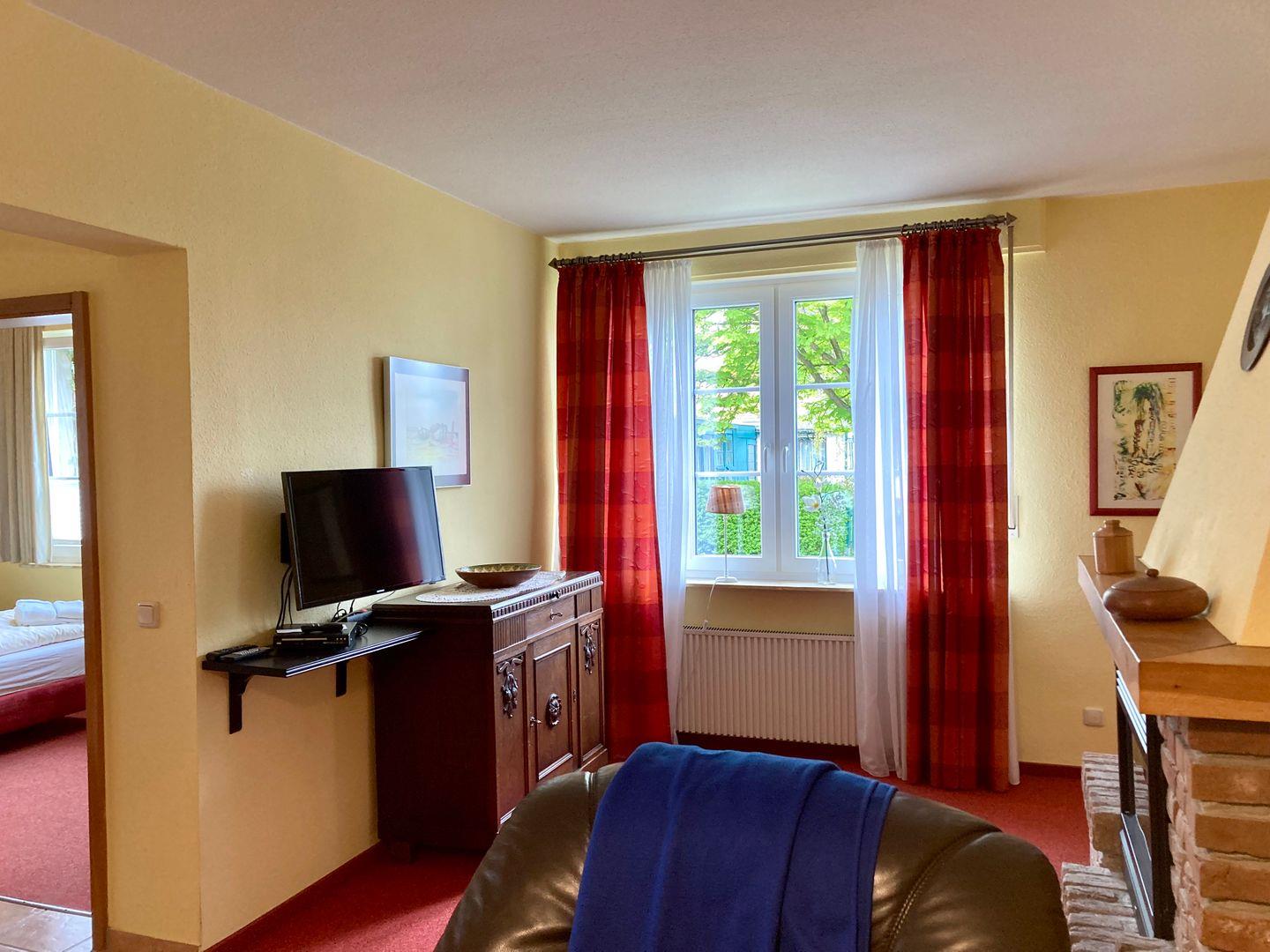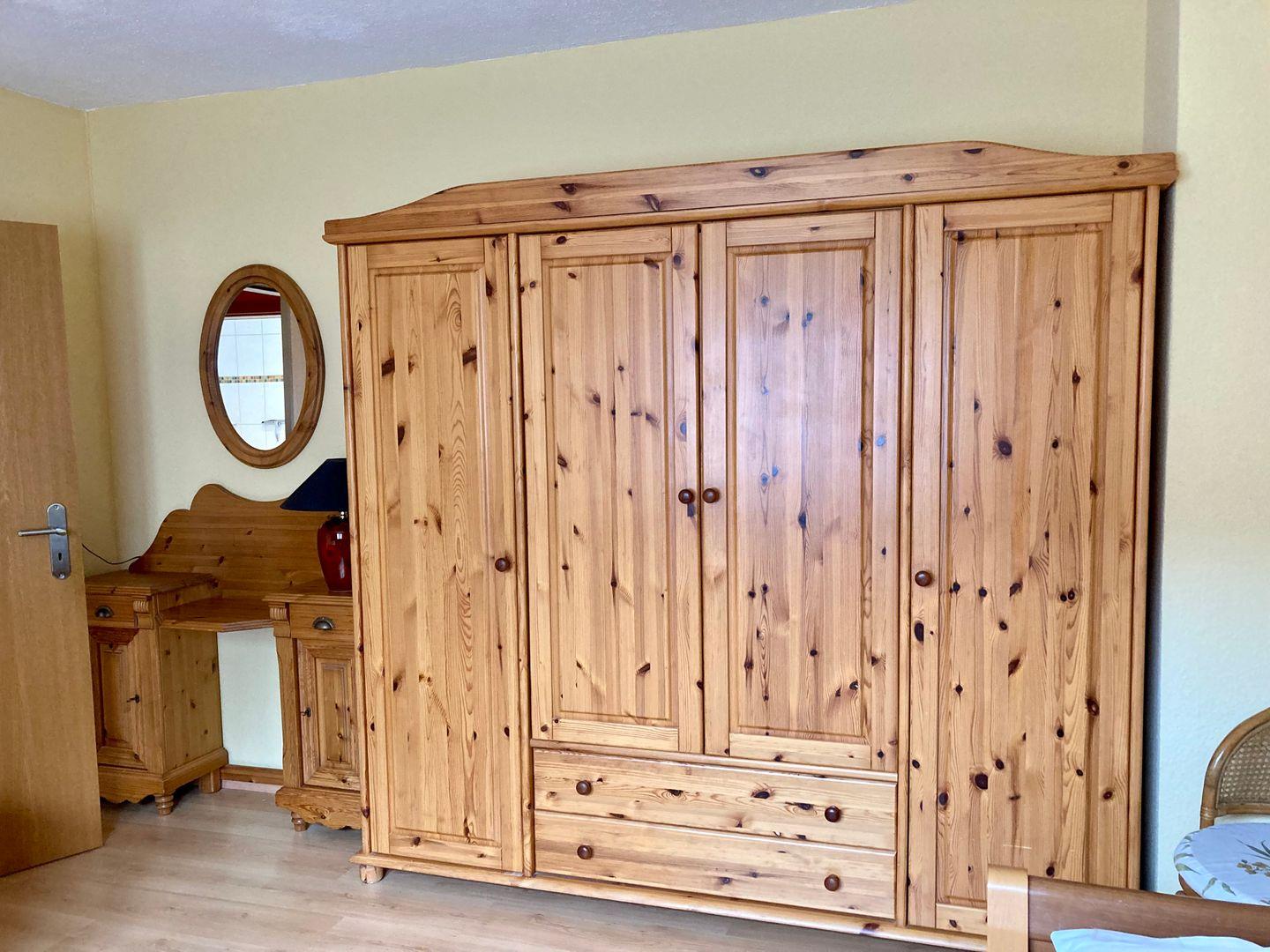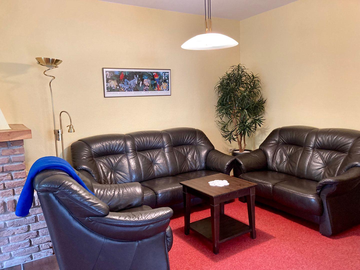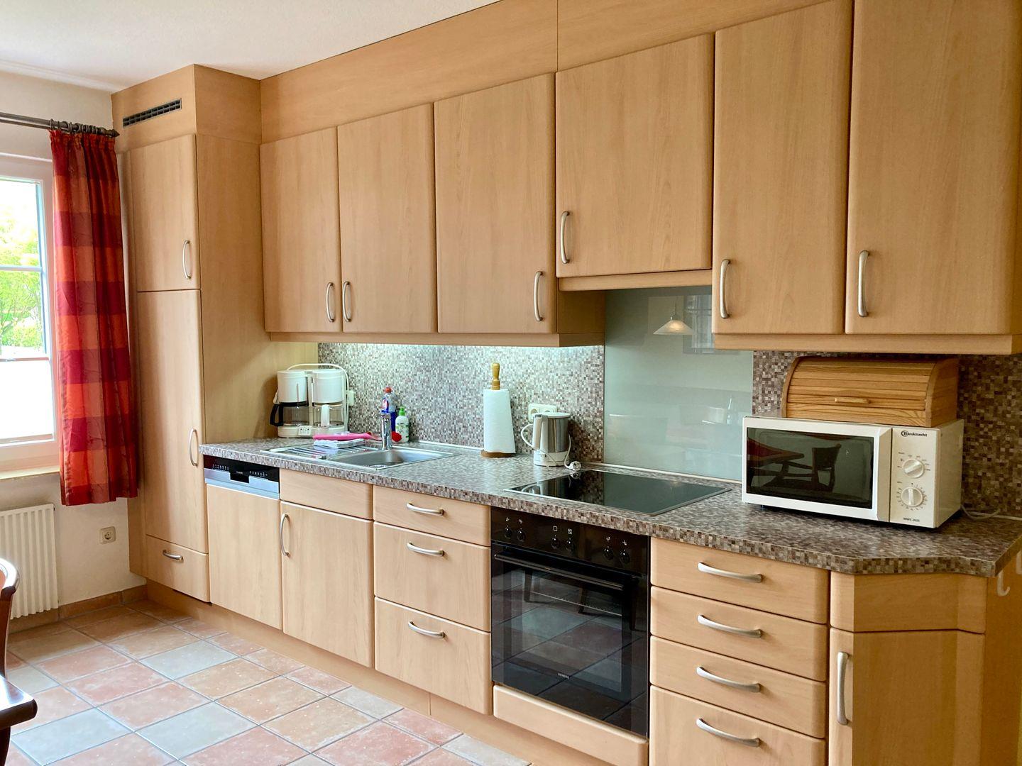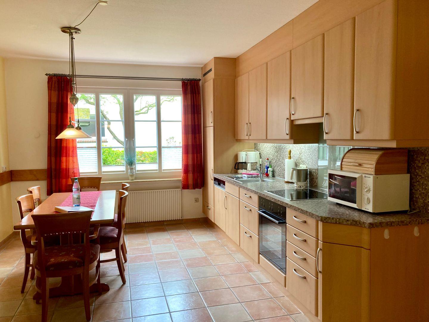 Essbereich und komplett ausgestattete Küche mit 4-Platten-Cerankochfeld, Backofen, Mikrowelle, Eierkocher, ausreichend Geschirr und Besteck, Kühlschrank mit TK-Fach, Kaffeemaschine, Wasserkocher, Elektro-Handmixer, Toaster, und Esstisch mit 6 Stühlen.Wohnbereich mit Kabel-T`V, DVD Player, Internetzugang(WLAN). Ein Bücherschrank mit Literatur und Spielen steht unseren Gästen ebenfalls zur Verfügung. Die Wohnung hat drei Schlafzimmer, das Bad wurde kürzlich komplett renoviert, mit WC, ebenerdiger Dusche, höhenverstellbares Waschbecken und Duschstuhl. Die Wohnung hat auch ein separates zweites WC.