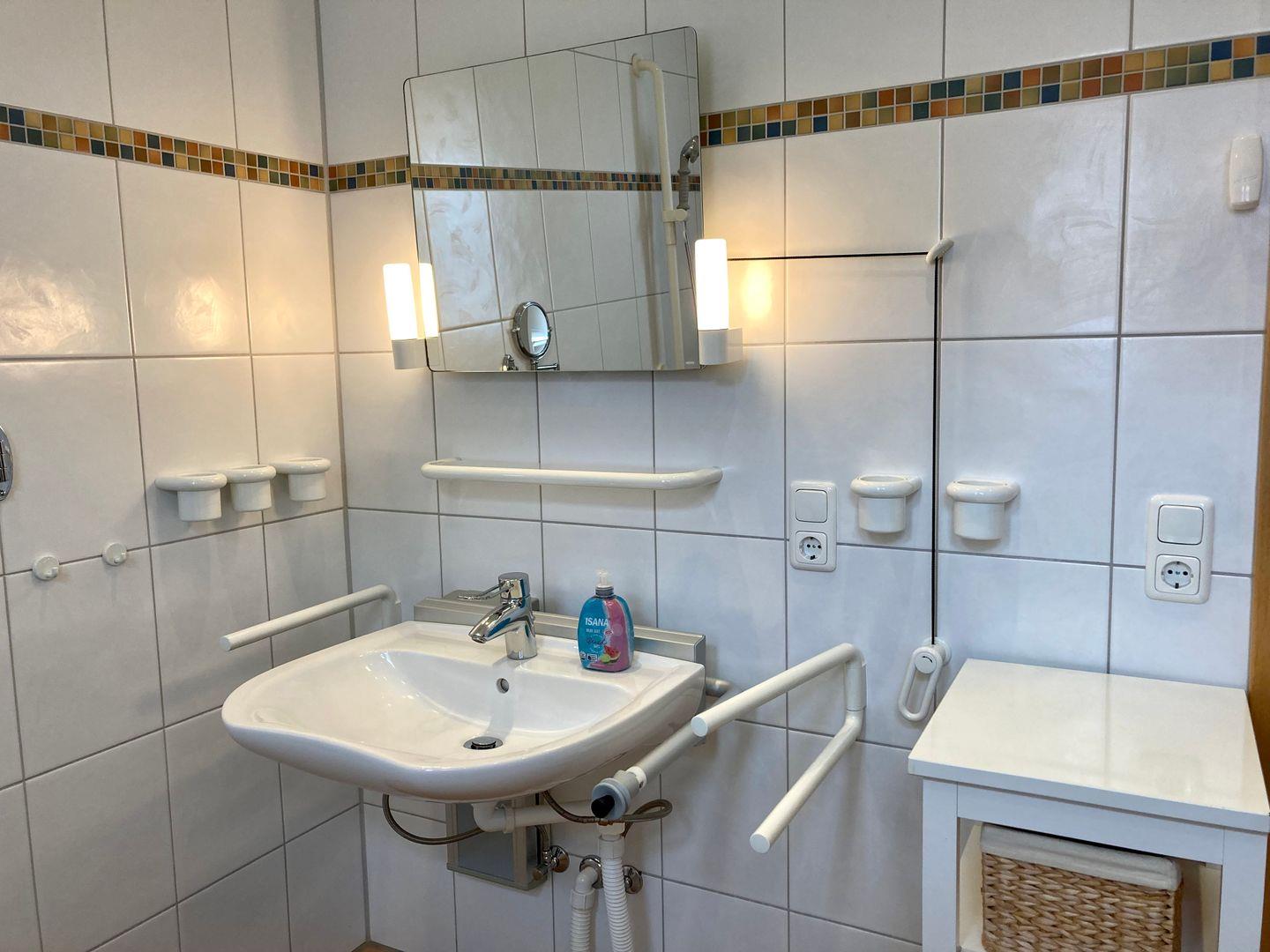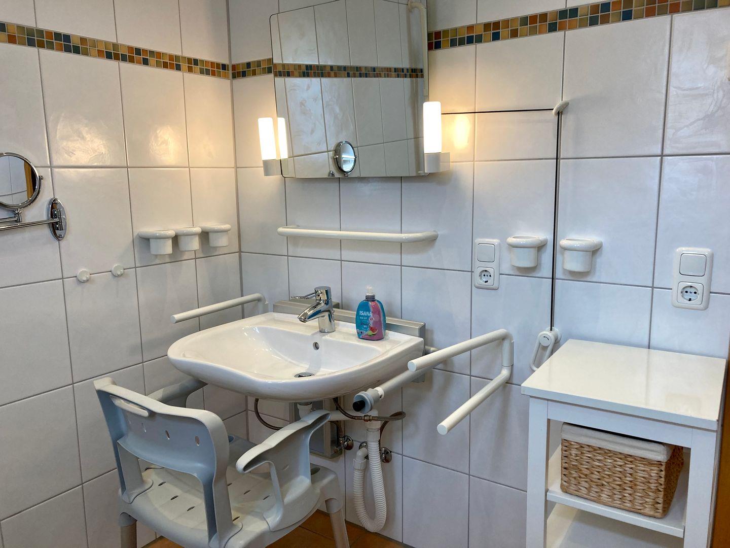 Essbereich und Küche mit 4-Platten-Cerankochfeld, Backofen, Mikrowelle, Eierkocher, ausreichend Geschirr und Besteck, Kühlschrank mit TK-Fach, Kaffeemaschine, Wasserkocher, Elektro-Handmixer, Toaster, und Esstisch mit 6 Stühlen.Wohnbereich mit T`V, DVD Player, Internetzugang(WLAN). Das Bad mit WC, ebenerdiger Dusche, höhenverstellbares Waschbecken und Duschstuhl.