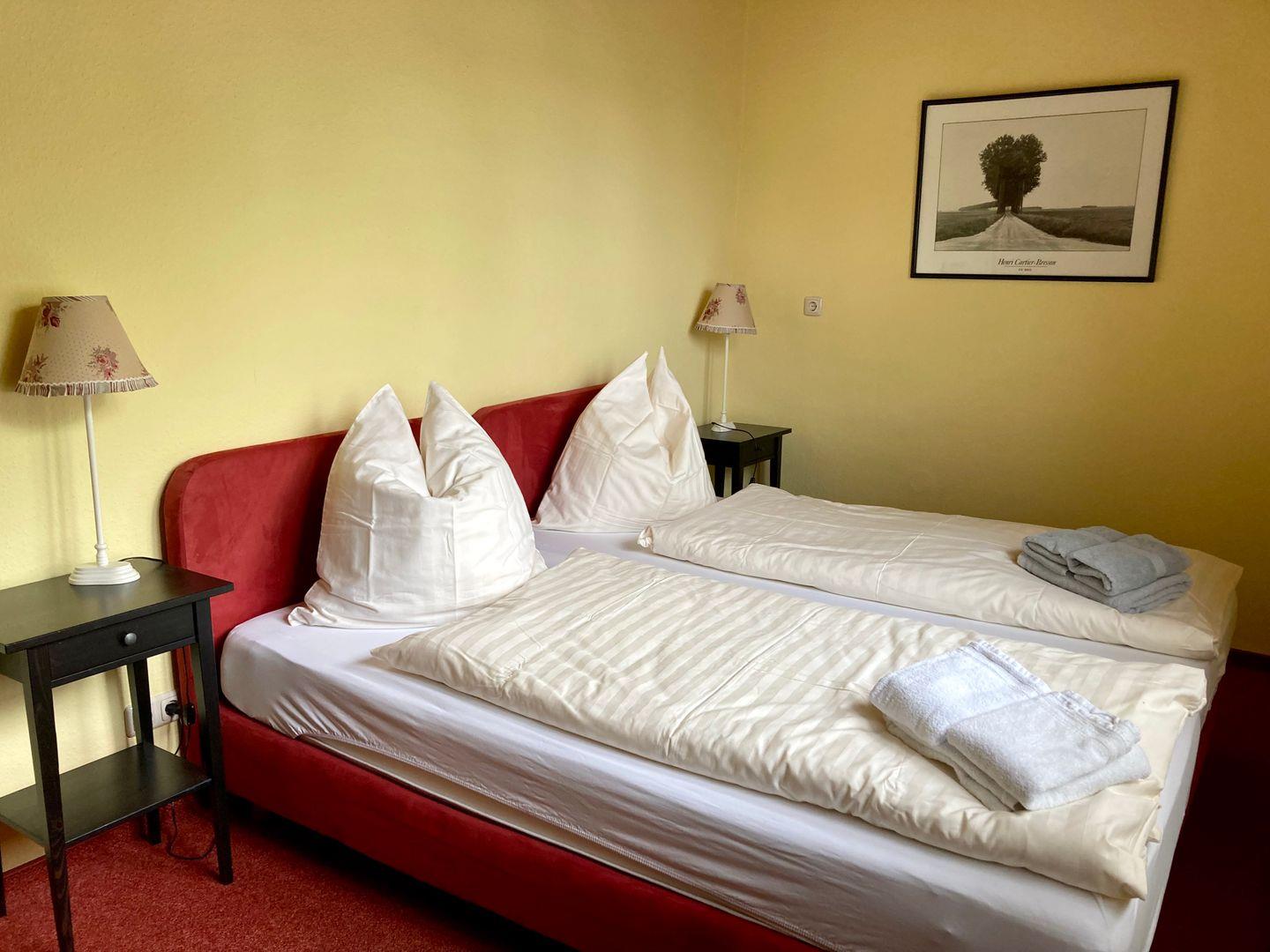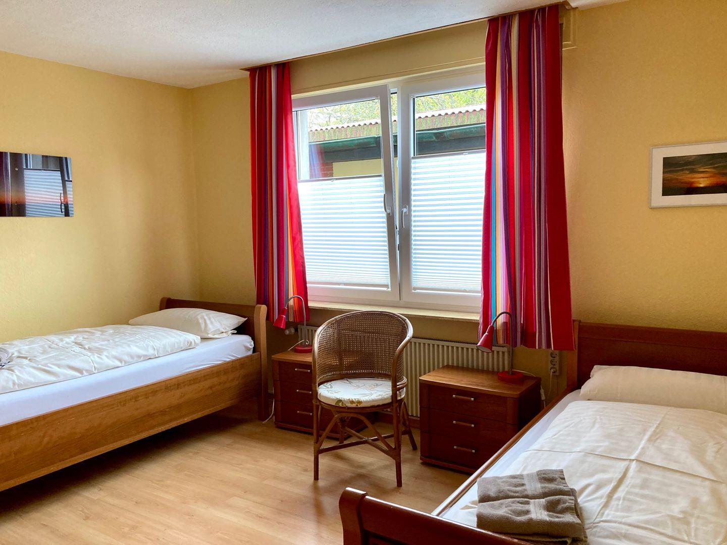 Es handelt sich um eine sehr geräumige, barrierefreie Wohnung mit 3 Schlafzimmern (2, 2 ,1 Personen). Zum Schlafzimmer mit einem Doppelbett kommt ein weiteres Schlafzimmer mit zwei einzeln stehenden Seniorenbetten und ein drittes Schlafzimmer mit einem Einzelbett. Außerdem steht in der Wohnung eine Waschmaschine mit Trockner und Bügelgelegenheit zur Verfügung.