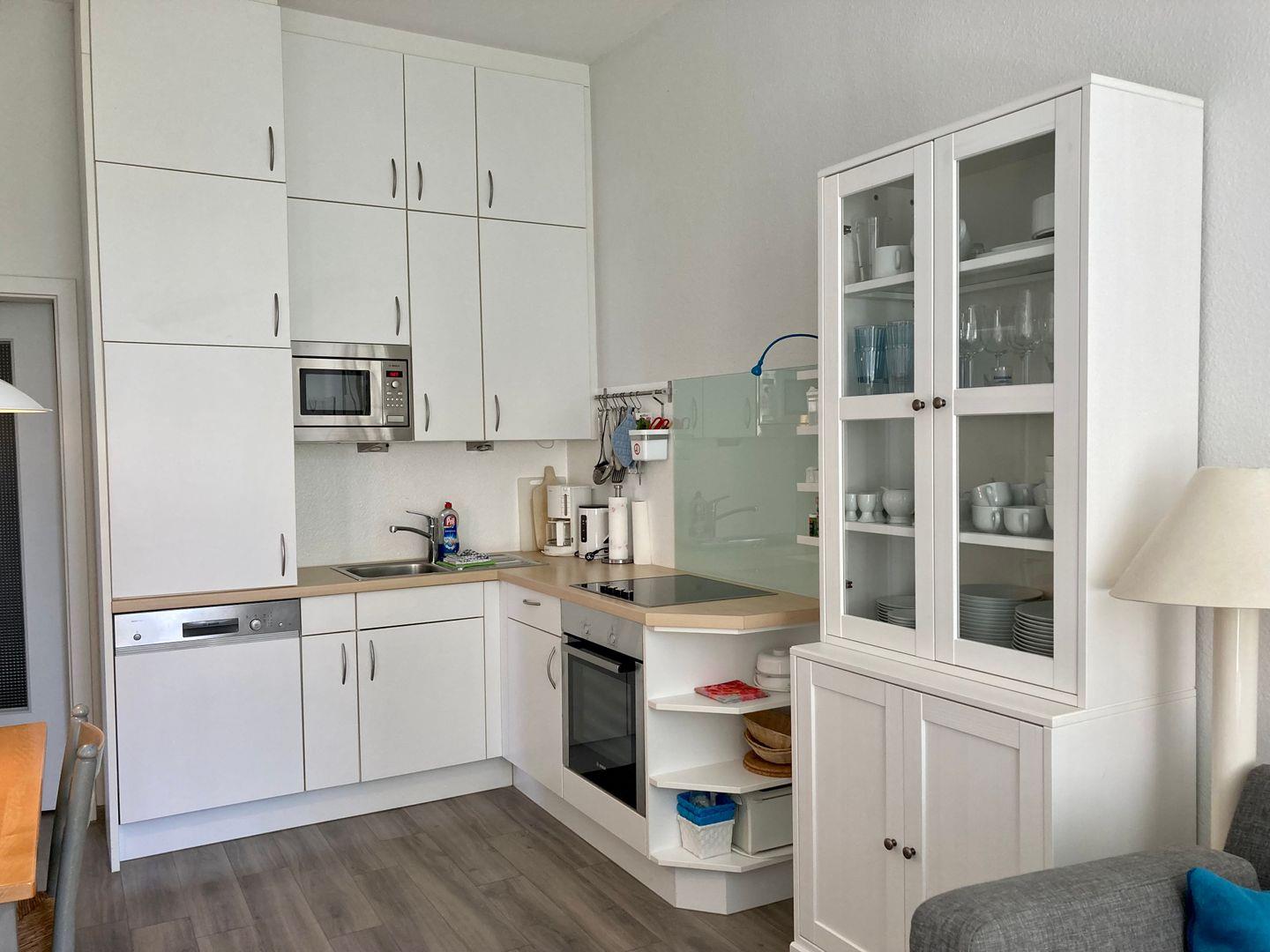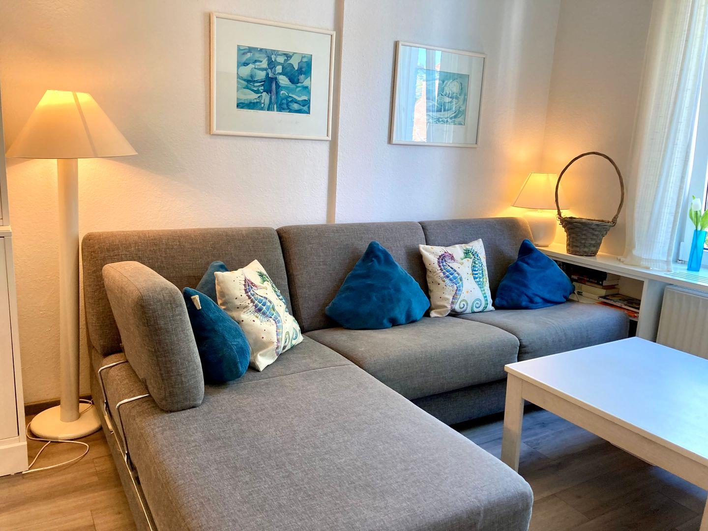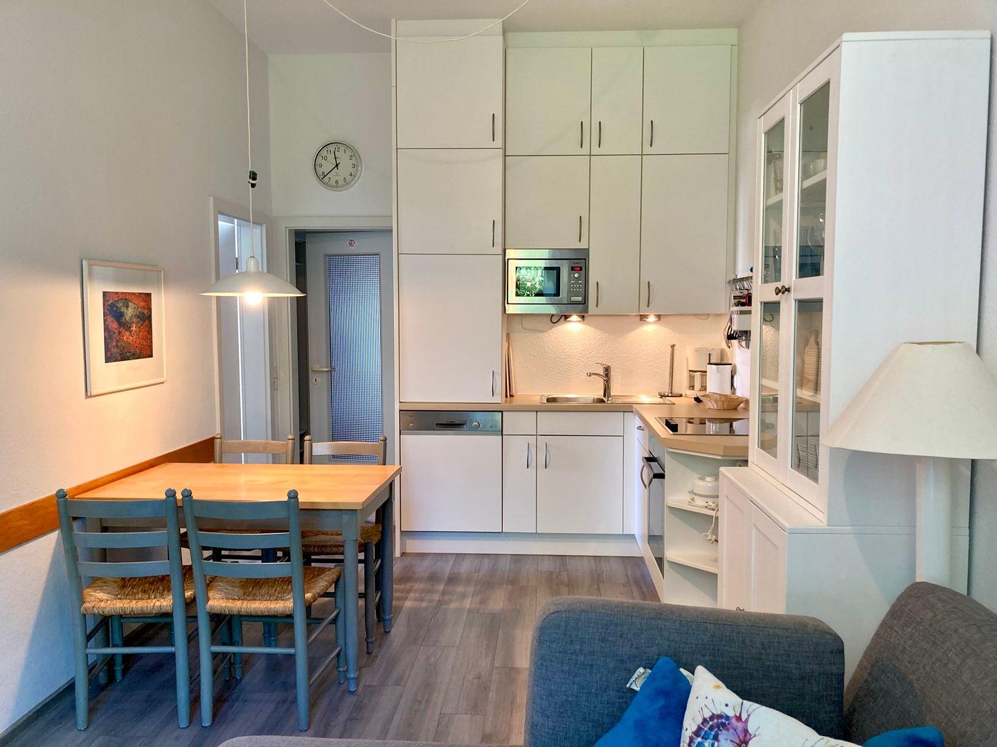 Weiterhin bietet diese Wohnung eine moderne und gemütliche Couchlandschaft, die zum Verweilen und „Klönen“ einlädt. Pfiffig an den Wohnbereich angegliedert findet sich eine hochwertige Küchenzeile mit umfangreicher Ausstattung und zugehörigem Essbereich. Ergänzend sind der Wohnungsflur mit viel Stauraum und das geräumige Duschbad zu nennen.