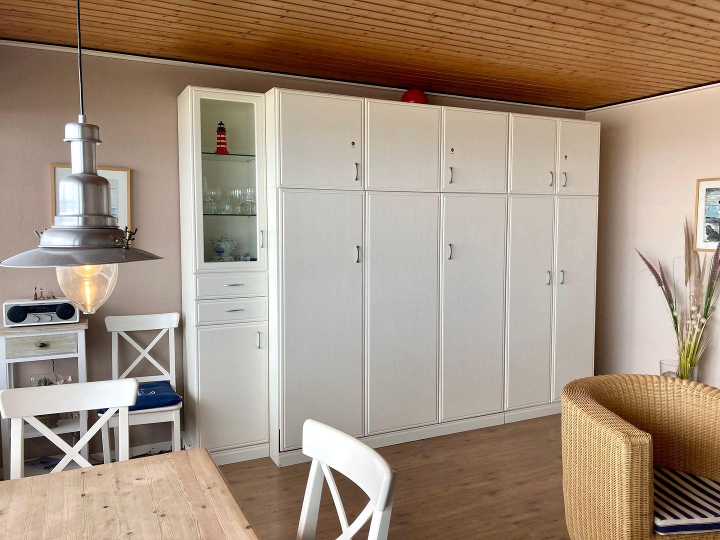 Das helle gemütliche Wohnzimmer mit Essecke bietet einen direkten Blick aufs Meer und den Nordbalkon