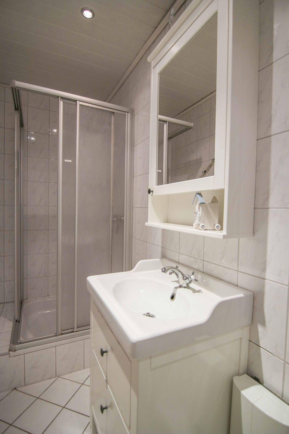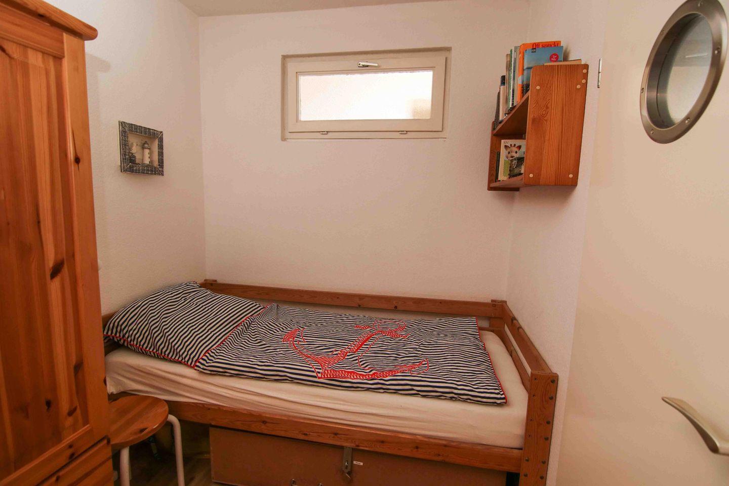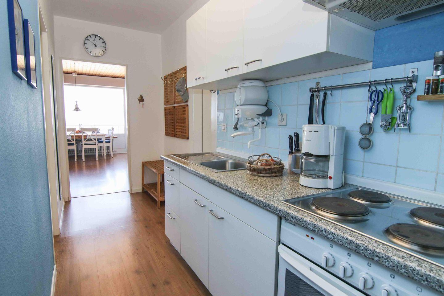 Die Küche befindet sich hier im Flur, so dass auch diese vom Wohnbereich abgetrennt werden kann. Vom Flur aus erreicht man auch das freundliche Duschbad. Gegenüber der Küche befindet sich das Schlafzimmer, welches über 2 Einzelbetten verfügt